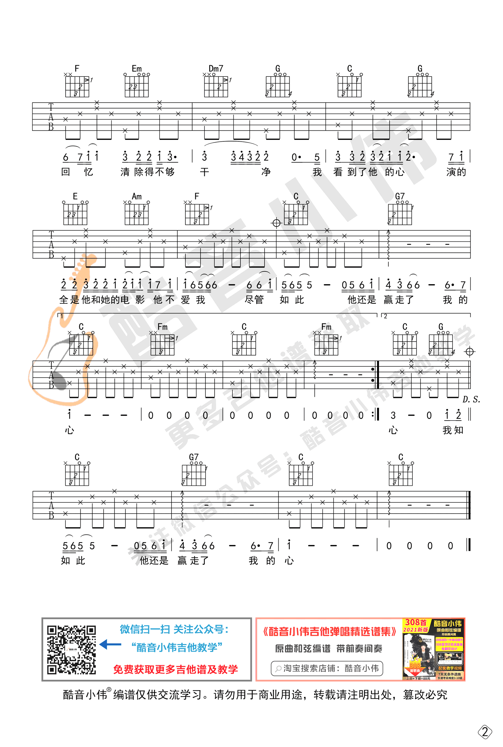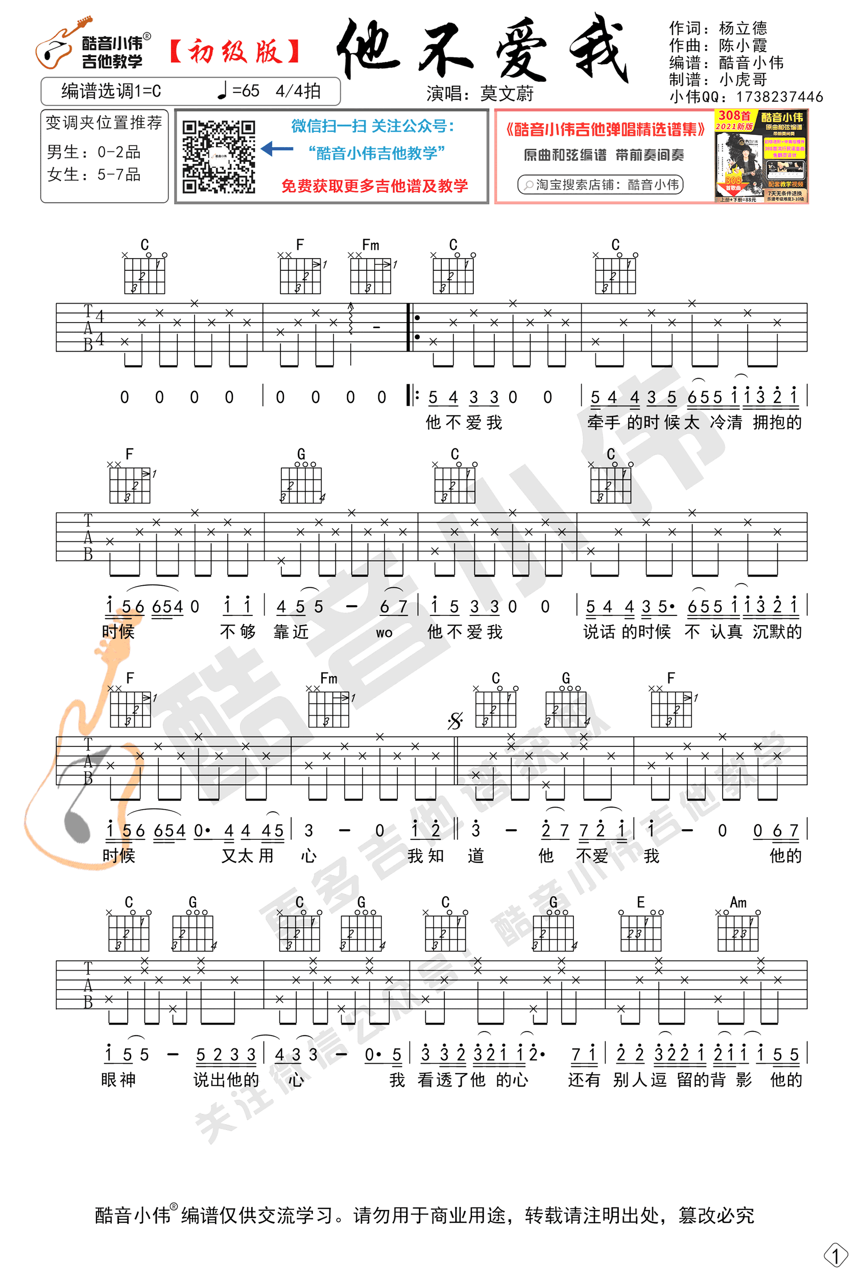 曲谱介绍: 他不爱我吉他谱,莫文蔚的一首虐心情歌,他不爱我六线谱,C调初级版,变调夹男生推荐0-2品女生5-7品,两张高清图片谱。酷音小伟制谱分享,琴谱网更新上传。