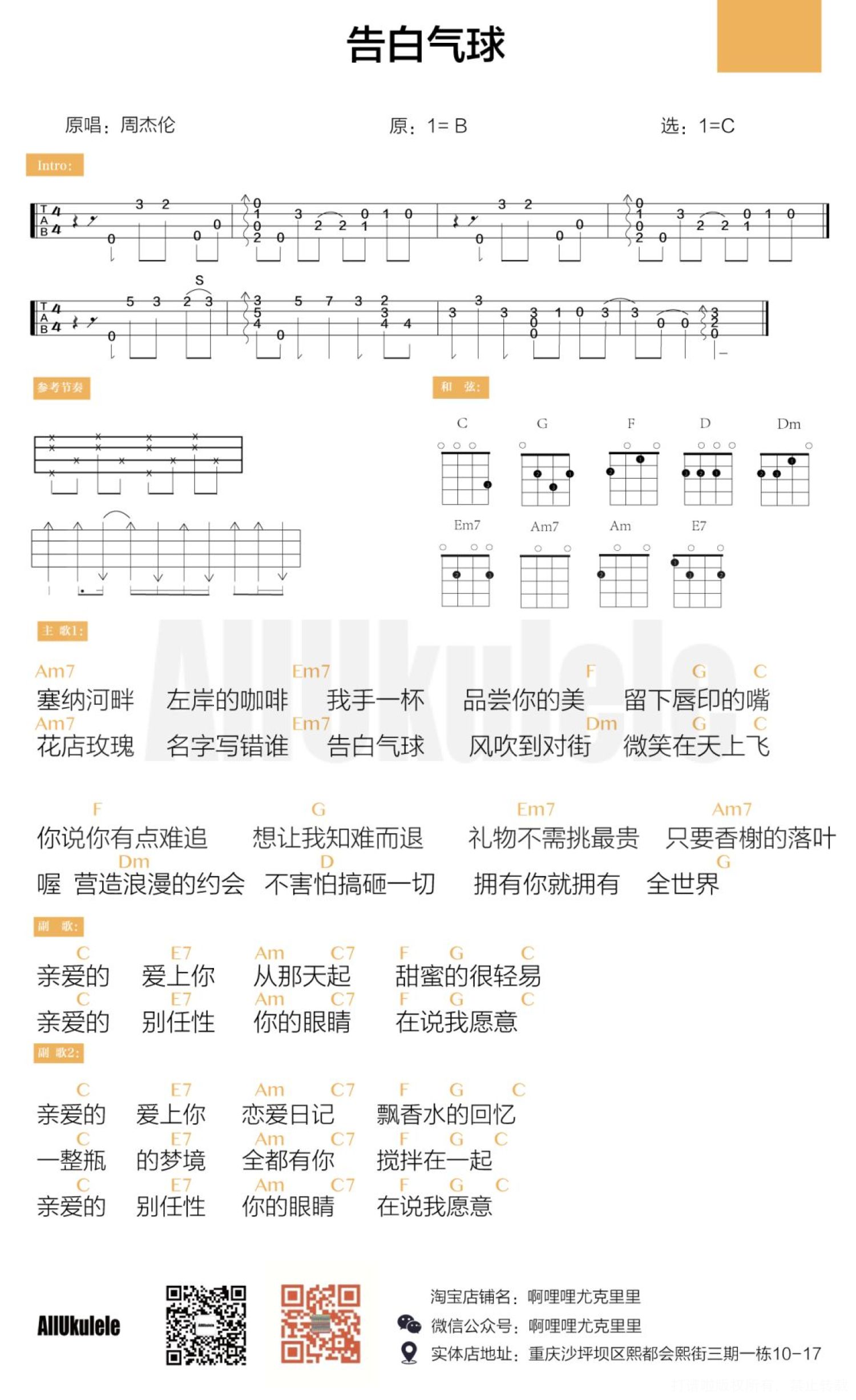 曲谱介绍: 《告白气球》尤克里里谱