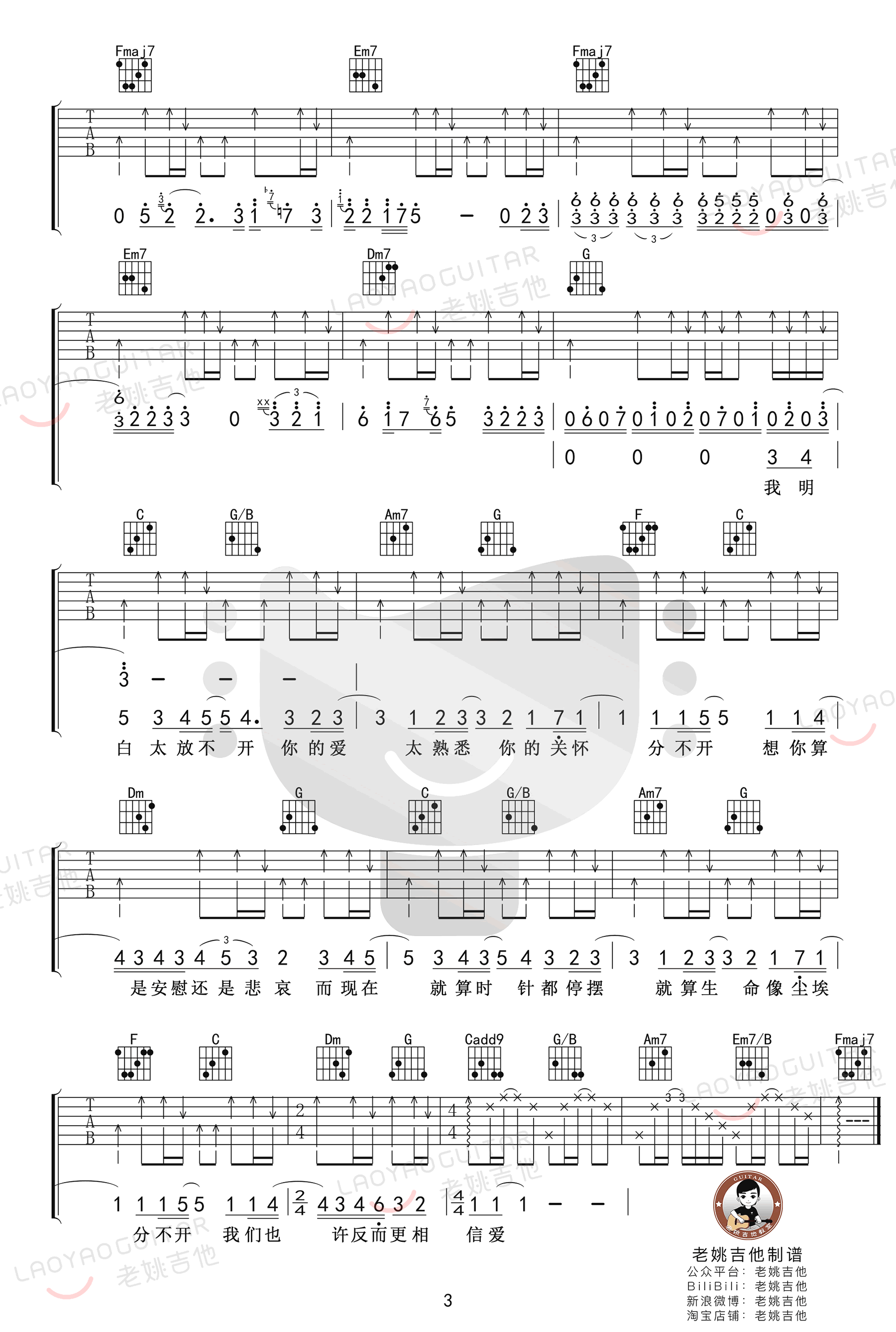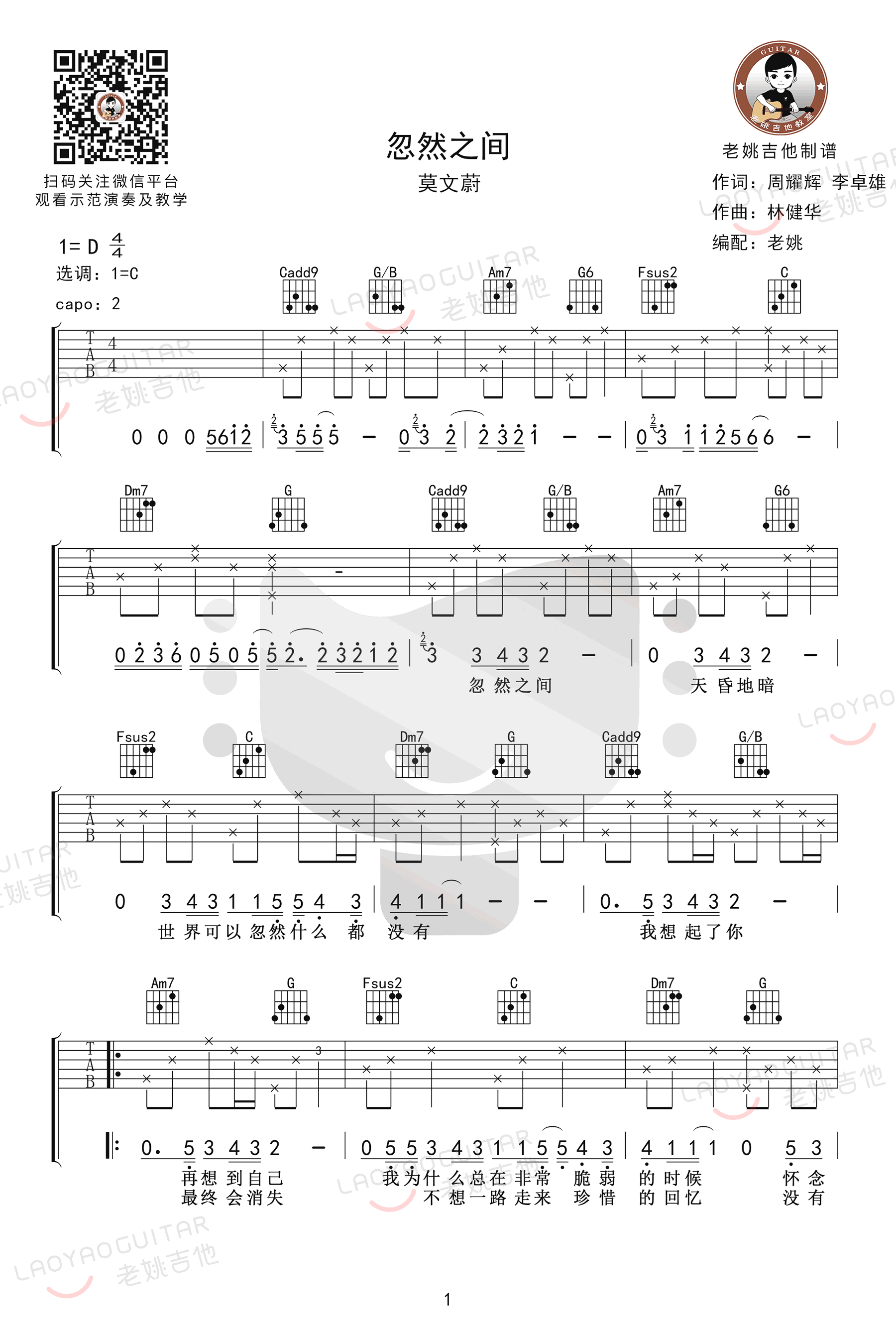 曲谱介绍: 忽然之间吉他谱,莫文蔚演唱的一首温暖动听的经典歌曲,忽然之间吉他六线谱,原调D,选用C调指法,变调夹夹二品,完整编配共三张高清图片谱例,老姚吉他出品,琴谱网更新上传。