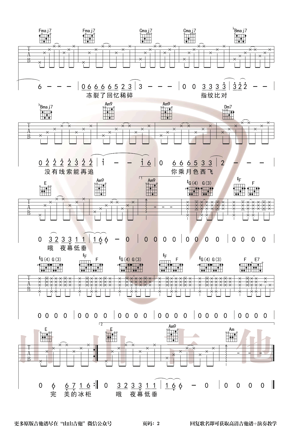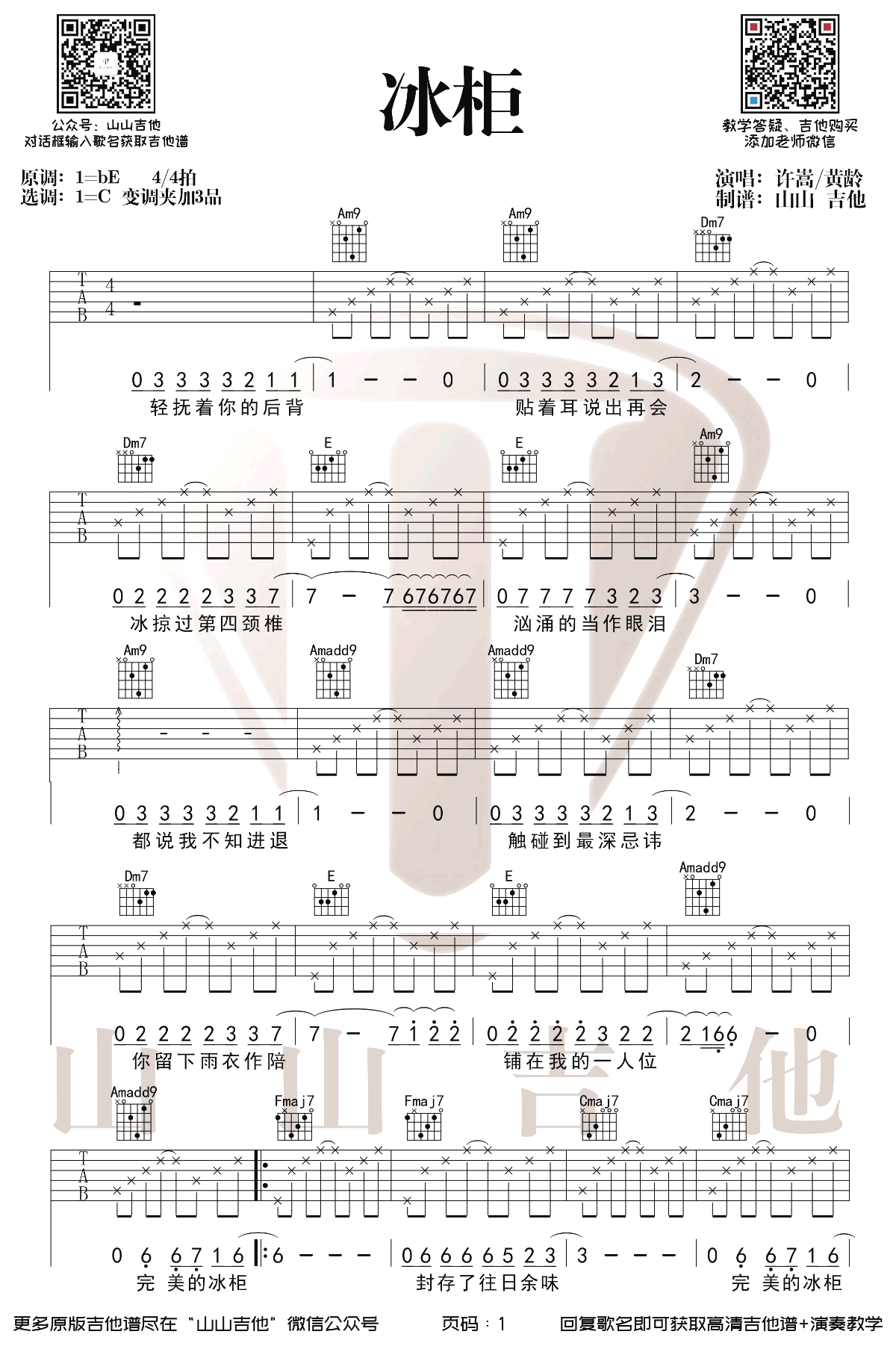 曲谱介绍: 冰柜吉他谱,许嵩黄龄演唱的一首颇受争议的歌曲,冰柜吉他六线谱,原调降E,选用C调指法,变调夹夹第三品,两张图片谱例,山山吉他制谱出品,琴谱网更新上传。 编配演奏说明:在和弦的编配上我们使用了色彩强烈的小7和弦,小9和弦,大7和弦,间奏中使用了经过和弦,造成了离调的色彩,加入了少许的拍弦技巧。这首歌完全摆脱了常规的套路,十分新颖,同学们可以练起来啦!