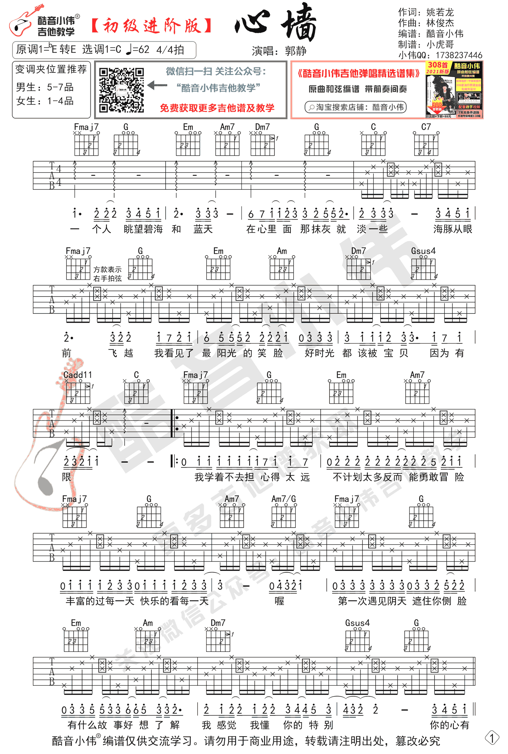 曲谱介绍: 心墙吉他谱,郭静的一首经典代表歌曲,心墙吉他六线谱,本谱使用C调指法编谱,变调夹位置推荐,男生:5-7品,女生:1-4品,适合初学进阶练习,琴友们可以跟着小伟老师视频教学分小节逐步学习。琴谱网整理分享。