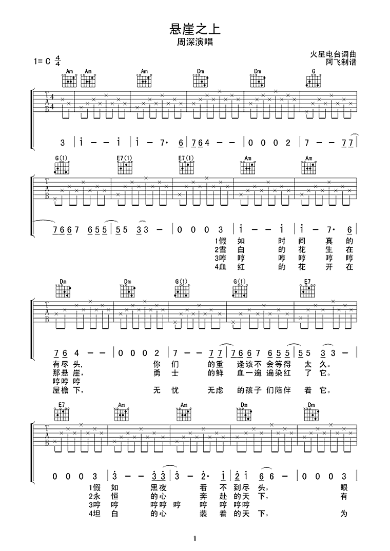 曲谱介绍: 悬崖之上吉他谱,周深演唱,张艺谋导演的电影《悬崖之上》主题曲。吉他弹唱谱选用C调指法,两张图片谱例。阿飞制谱,琴谱网更新上传。
