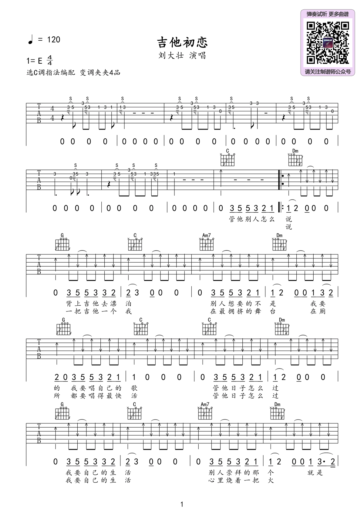 曲谱介绍: 吉他初恋吉他谱,刘大壮演唱的的一首热门歌曲,为你唤醒那些藏在心里的热情。吉他初恋六线谱,原调E,选用C调指法编配,变调夹夹第四品。三张弹唱图片谱,制谱师编配分享,琴谱网上传。