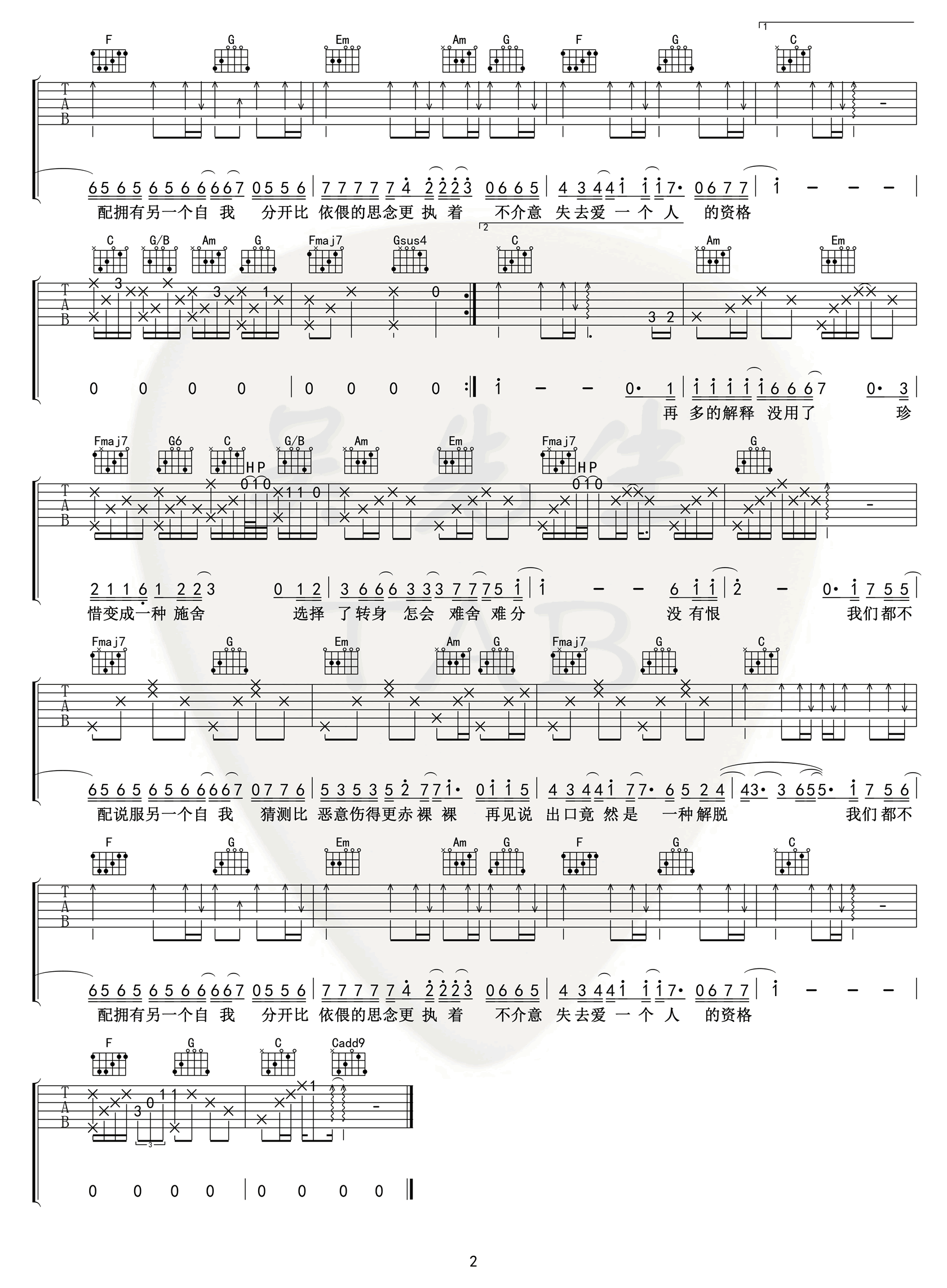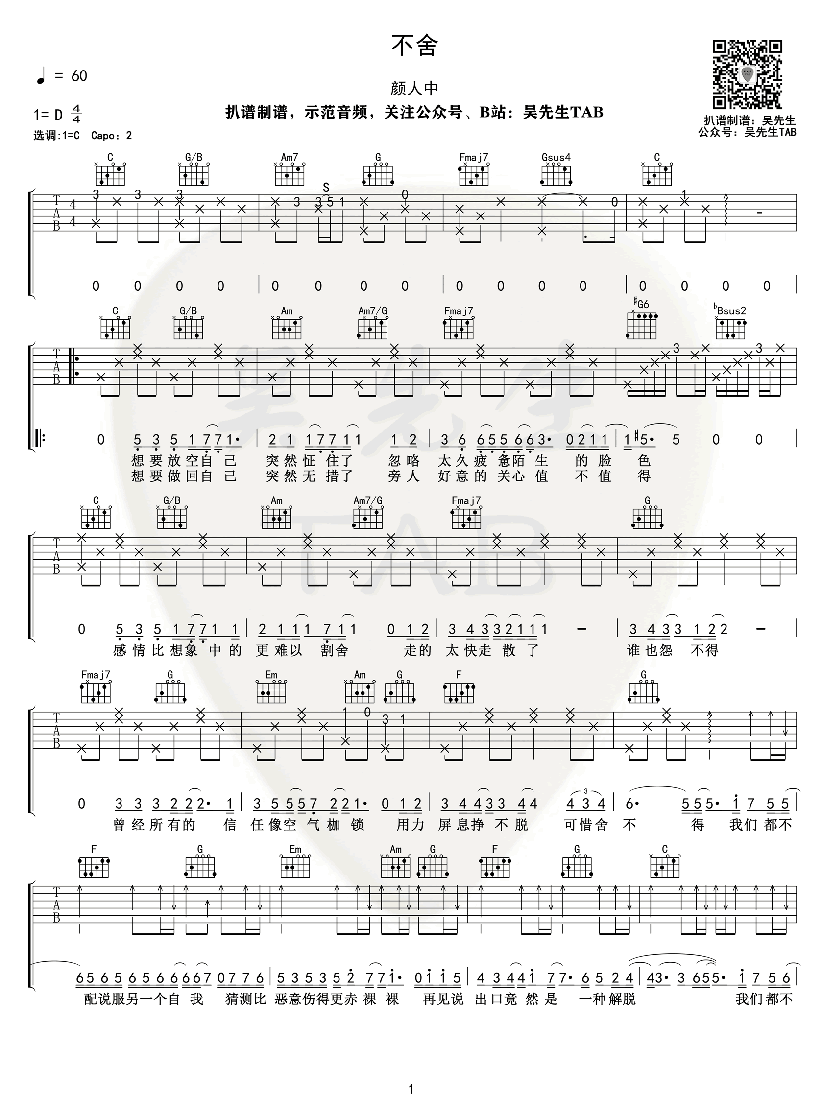 曲谱介绍: 不舍吉他谱,颜人中演唱,电影《我要我们在一起》推广曲。不舍六线谱,原调D,选用C调指法编配,变调夹夹二品。两张高清图片谱例。吴先生TAB制谱出品,琴谱网更新发布。 曾经多少个牵肠拉扯不舍的夜晚,到现在热情褪减成陌路的感叹。忽略了太久疲惫不堪陌生的脸色,原来终究走的太快,走散了。细碎的喜欢成为一种依赖一种习惯,还没来得及炫耀,竟已失去爱一个人的资格。爱和爱过只多一个字,可感情比想象中的更难以割舍。曾经所有的信任像空气枷锁,挣不脱,舍不下。徘徊在自我纠缠的边缘,任往昔自顾消减,再见竟然成为一种解脱。沉淀下思绪,默默转身,努力说服自己,分开或许是你我最好的选择。无关痛痒,只是不舍。--【文案编辑 漓】