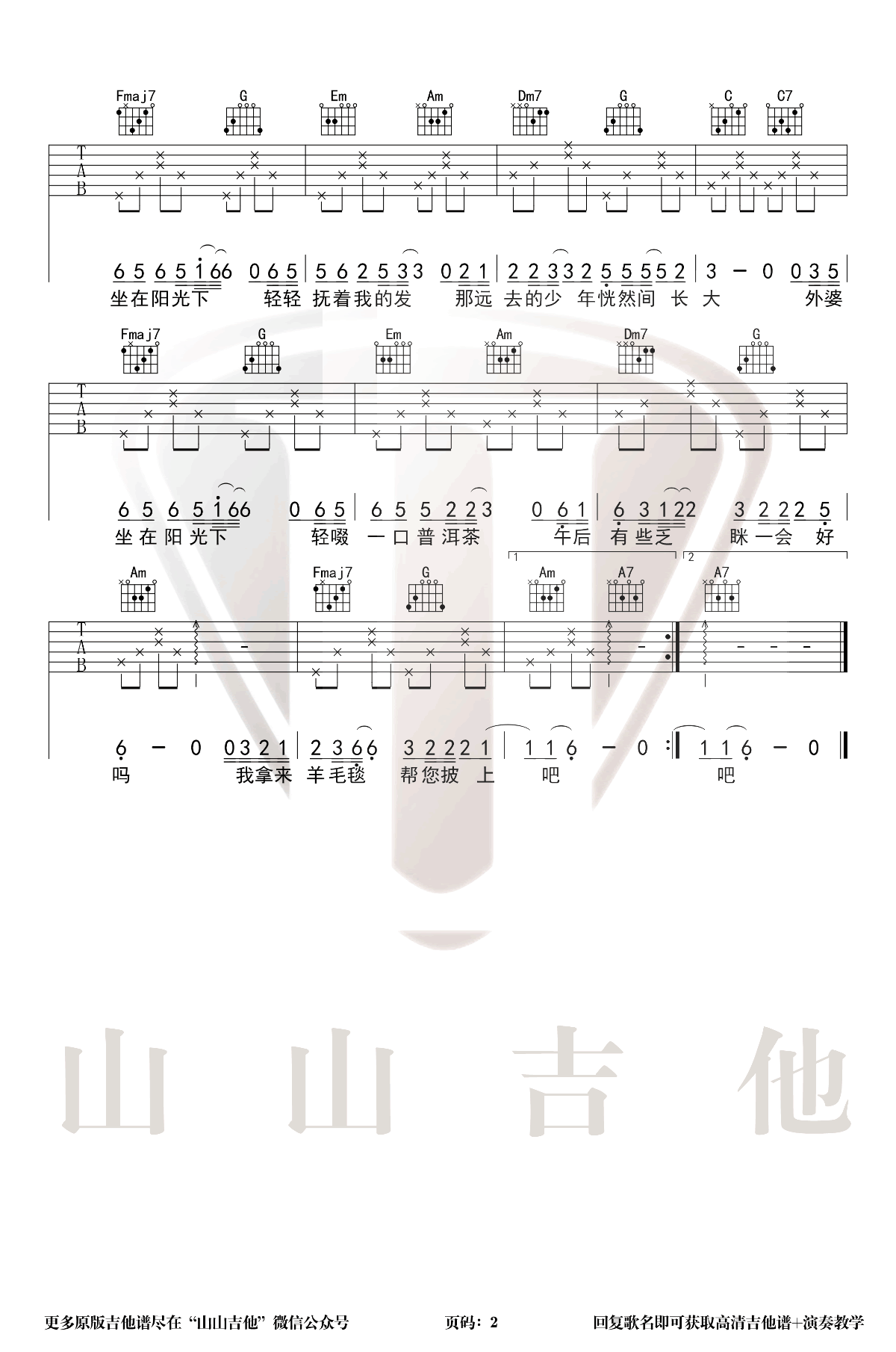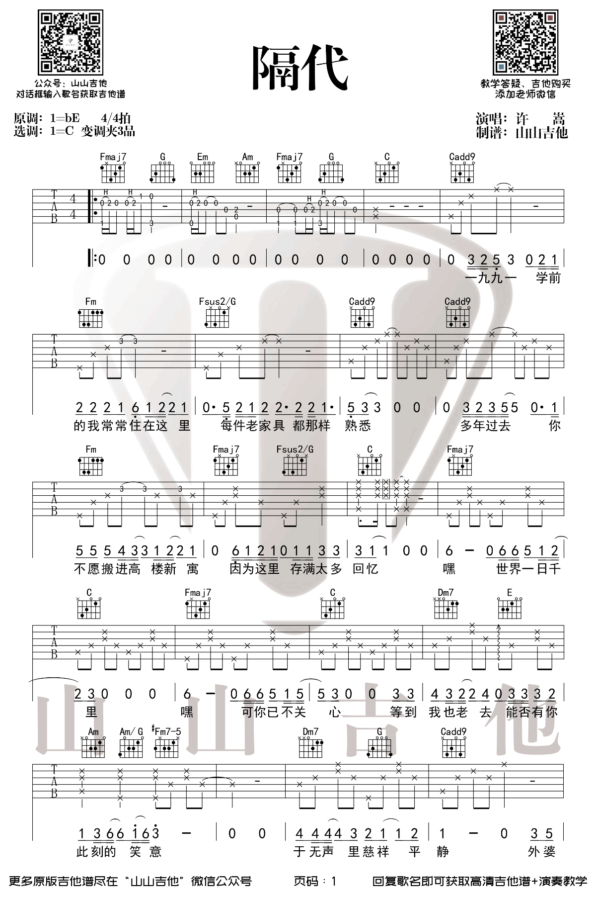 曲谱介绍: 隔代吉他谱,许嵩最新专辑《呼吸之野》中最温柔的一首歌。隔代六线谱,选用C调指法,变调夹三品,两张图片谱例。感谢山山吉他出品,琴谱网更新上传。