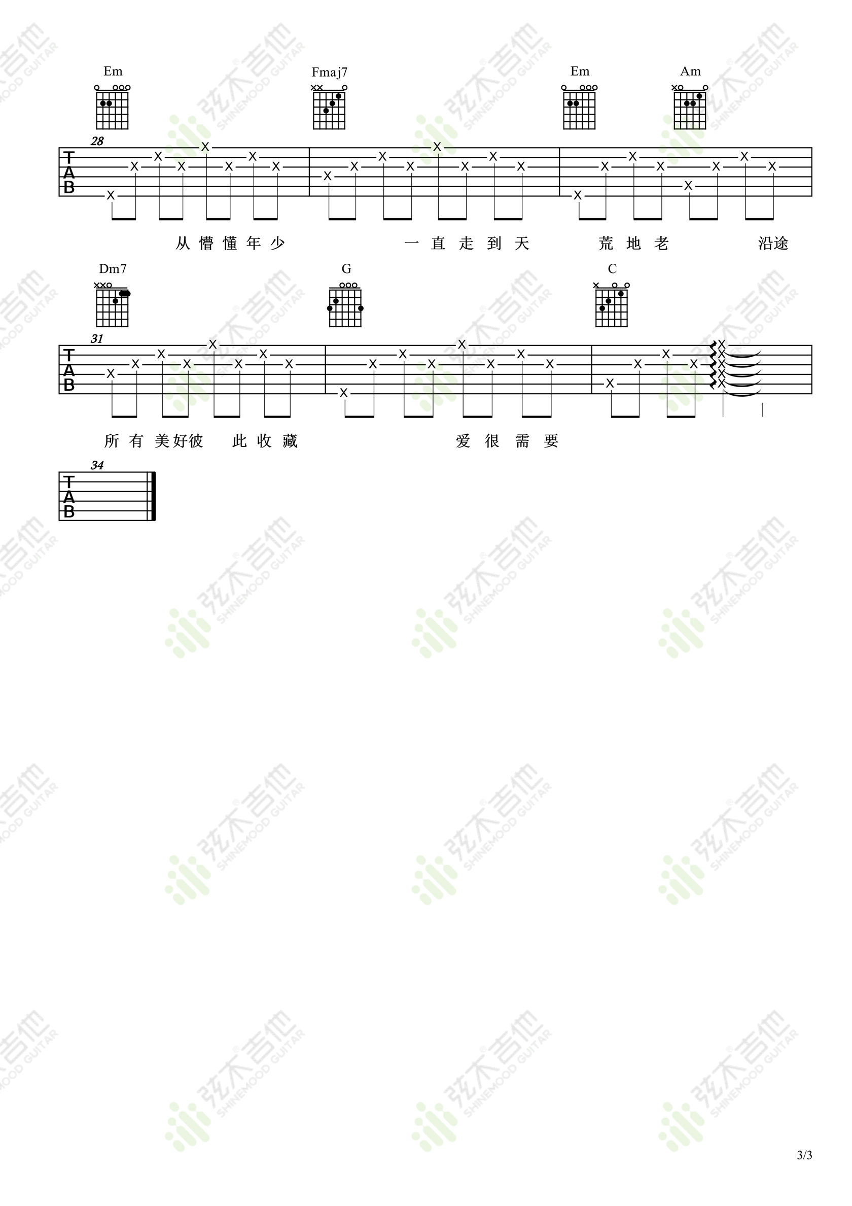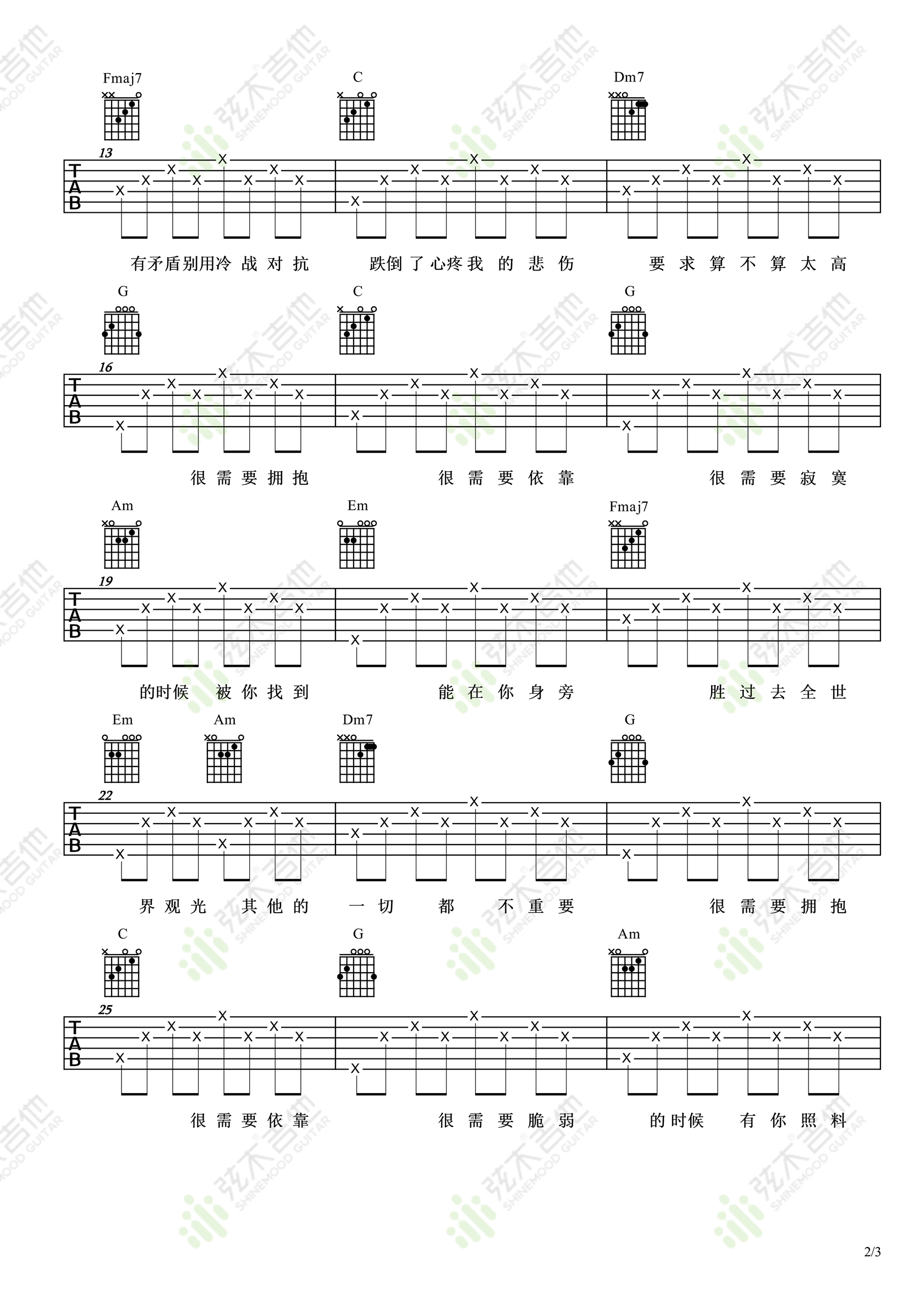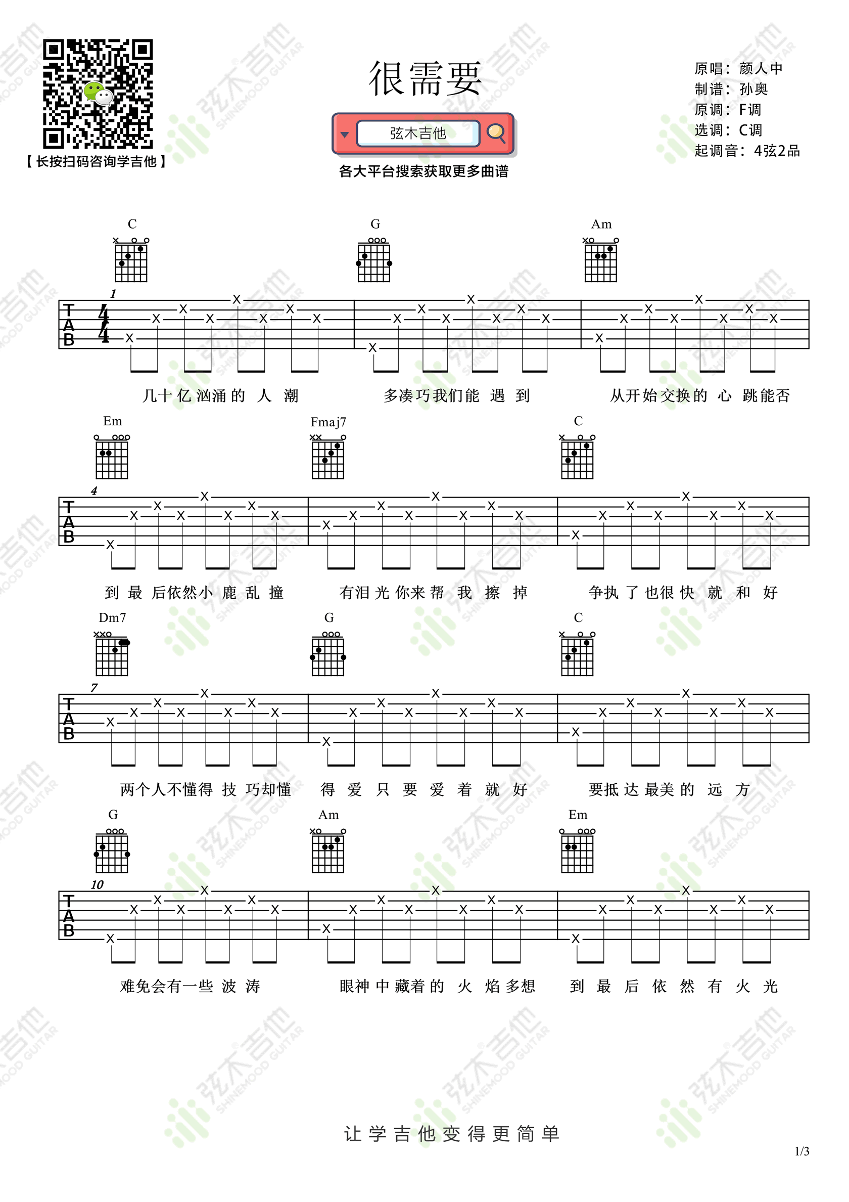 曲谱介绍: 很需要吉他谱,颜人中演唱的一首浪漫单曲,很需要六线谱,原调F选调C,起调音四弦二品,三张弹唱图片谱。弦木吉他编配出品。