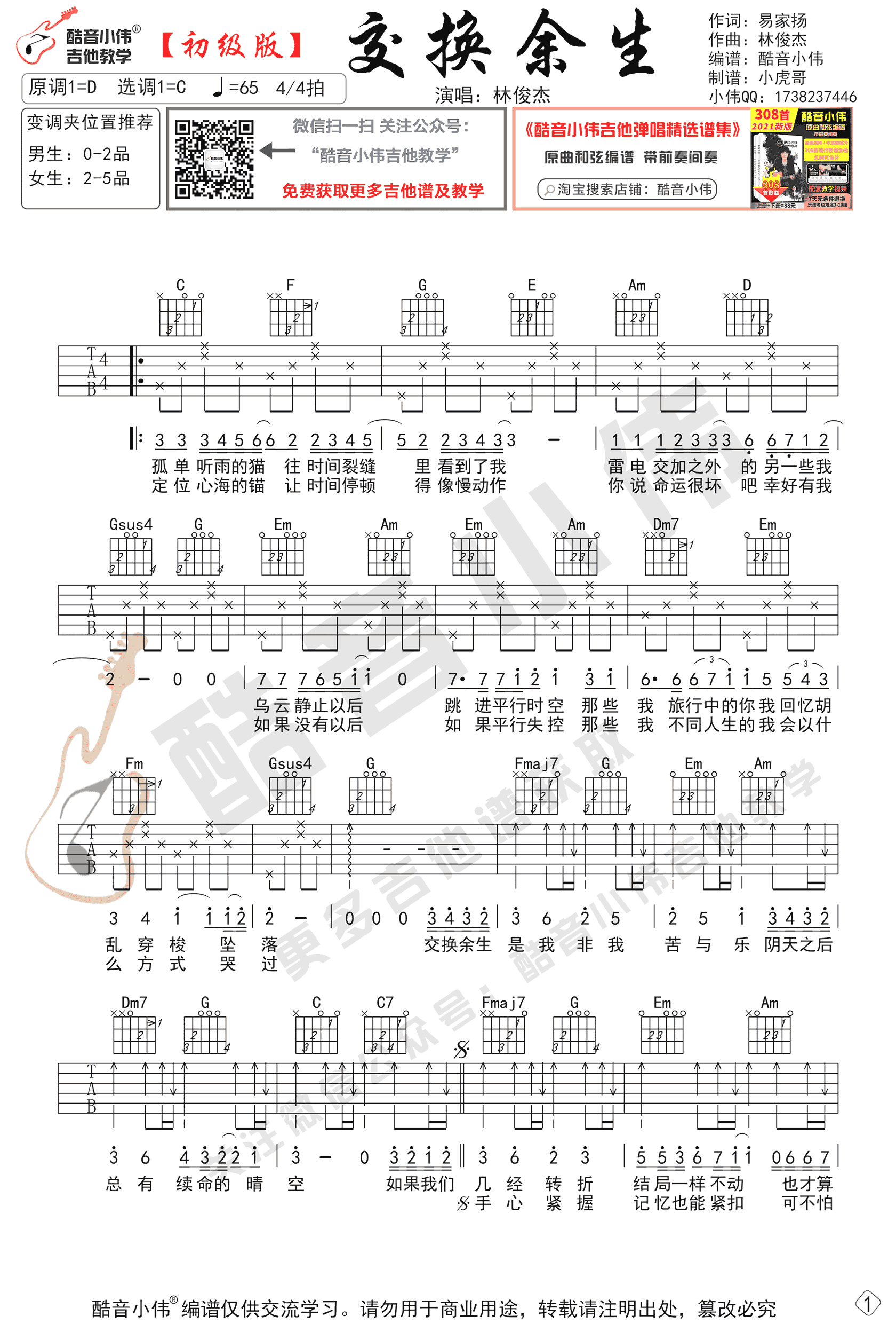 曲谱介绍: 交换余生吉他谱,林俊杰演唱,原调D,选用C调指法,变调夹推荐,男生0-2品女生2-5品。夹交换余生吉他弹唱谱,初级版编配,两张图片六线谱,琴谱网感谢酷音小伟出品分享。