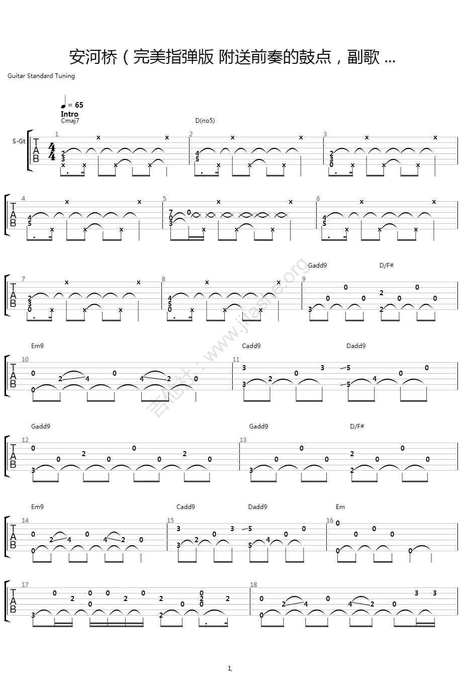 曲谱介绍: 安和桥指弹吉他谱,宋冬野的经典民谣歌曲,安河桥吉他独奏谱,附送前奏的鼓点,副歌,图片谱共三张谱例,感谢苍雪之牙编配,琴谱网更新上传。 第一行第二行可以参考原曲的鼓的部分,三四行是弹唱部分的节奏,建议优先练习 主歌副歌不是特别的难,建议耐心去啃,节奏方面原唱有好几个版本,我就参考了mv的版本扒制改编。