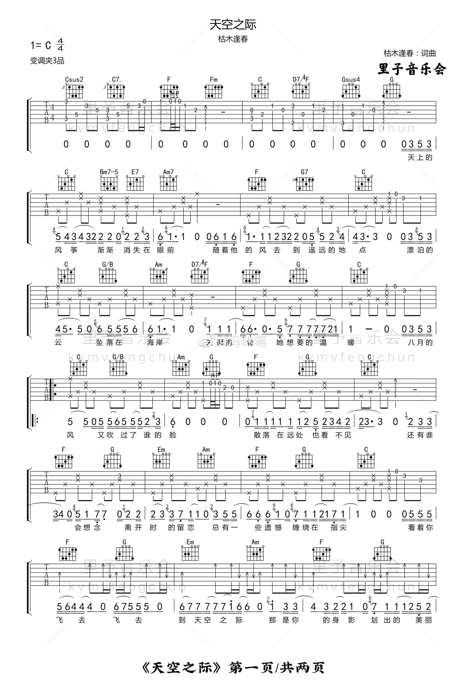 曲谱介绍: 天空之际吉他谱,枯木逢春最新原创民谣歌曲,天空之际吉他六线谱,C调指法,变调夹夹三品。两张高清图片谱,里予音乐会出品,琴谱网更新上传。