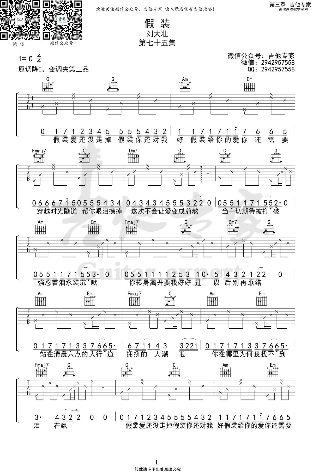 曲谱介绍: 《假装》吉他谱,刘大壮演唱,原调降E,选用C调,变调夹夹三品。假装吉他六线谱,完整版编配共四张弹唱图片谱例。琴谱网更新分享,感谢吉他专家制谱出品。