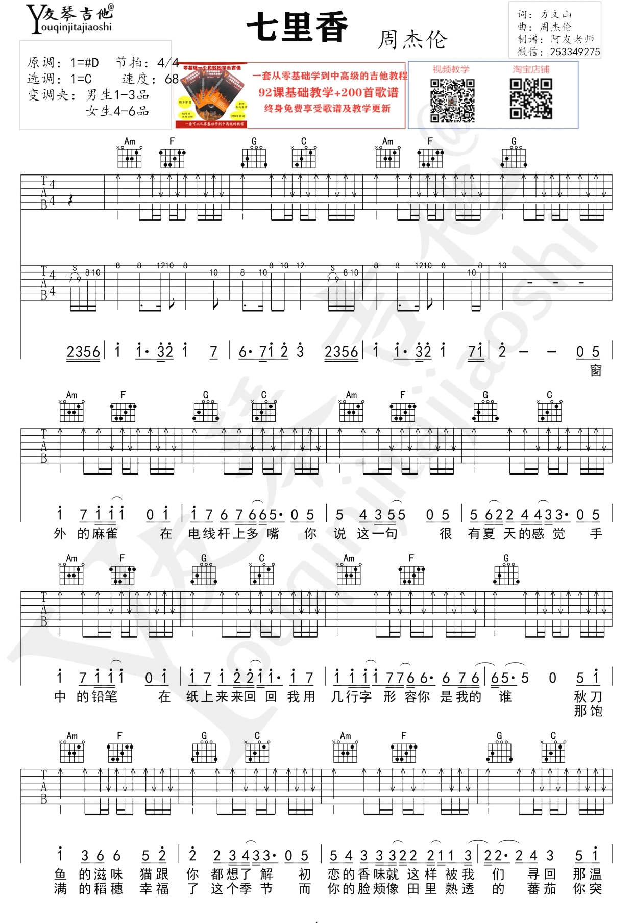 曲谱介绍: 七里香吉他谱,C调双吉他版本,周杰伦演唱,七里香吉他六线谱,原调升D选调C,变调夹推荐,男生1-3品女生4-6品,两张图片谱例。琴谱网感谢友琴吉他教室编配分享。 随谱附上吉他弹唱教学视频,本曲谱前奏部分,由两把琴配合,分别是节奏和华彩主音solo部分组成,歌曲扫弦要把握好自由的感觉,琴友们跟随老师的示范讲解练习。