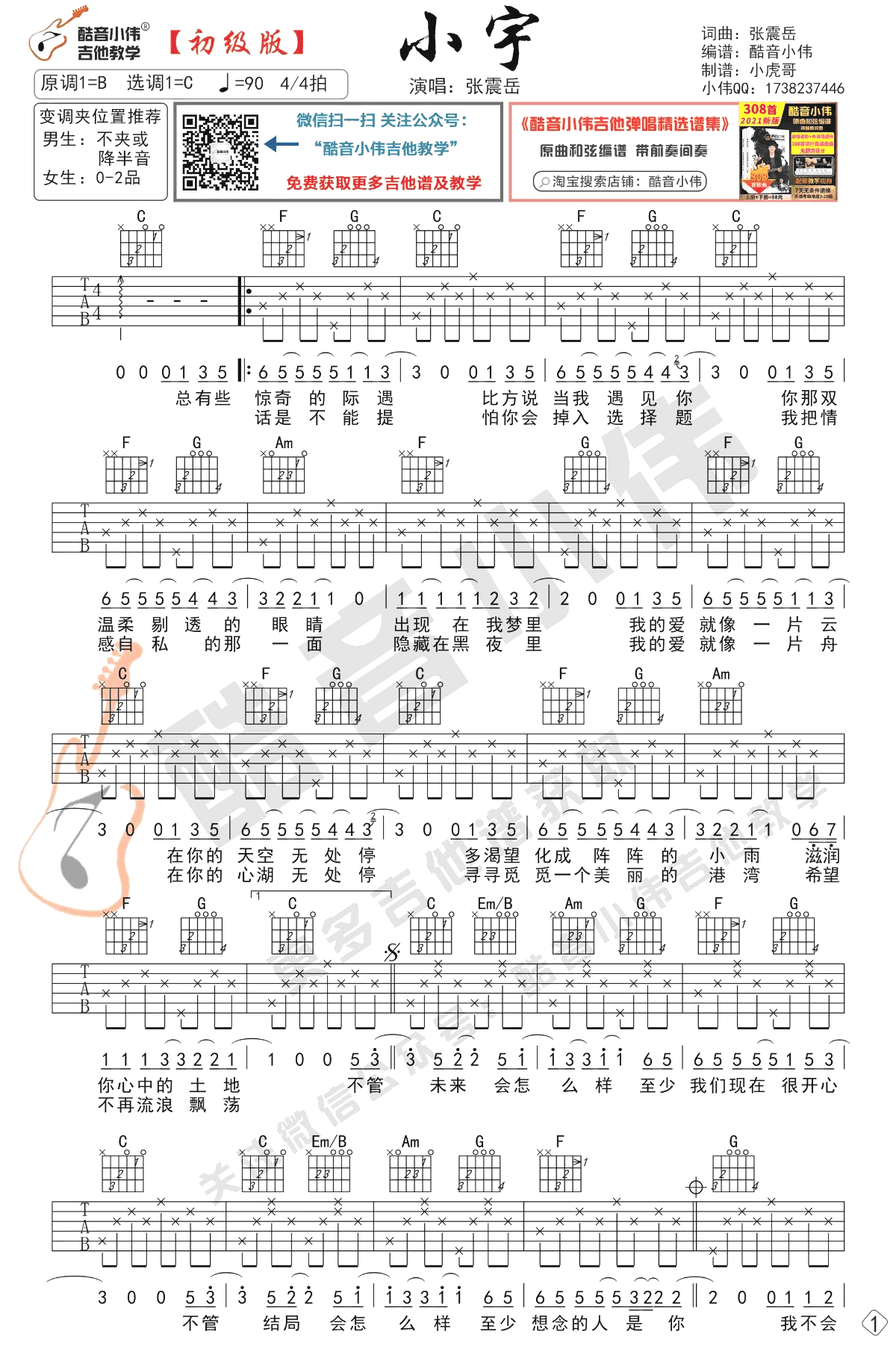 曲谱介绍: 小宇吉他谱,张震岳的一首经典老歌,小宇吉他六线谱,原调B选调C,变调夹推荐男生不夹或降半音,女生0-2品,两张图片弹唱谱例。感谢酷音小伟出品,琴谱网曲谱更新。