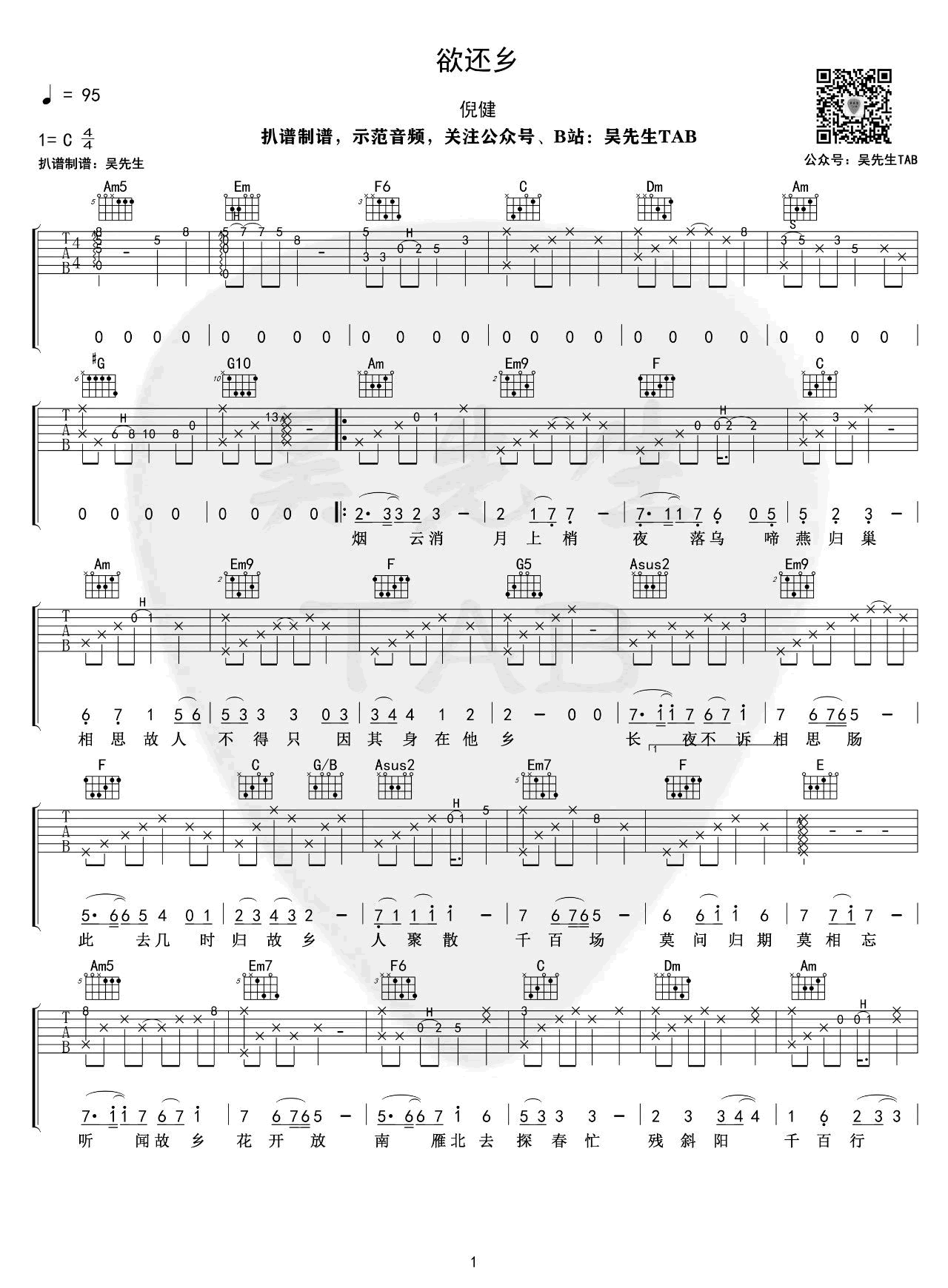 曲谱介绍: 欲还乡吉他谱,倪健词曲原创的一首民谣歌曲,欲还乡吉他弹唱谱,C调和弦编配,三张图片六线谱,琴谱网整理上传,更新吴先生TAB扒谱分享。