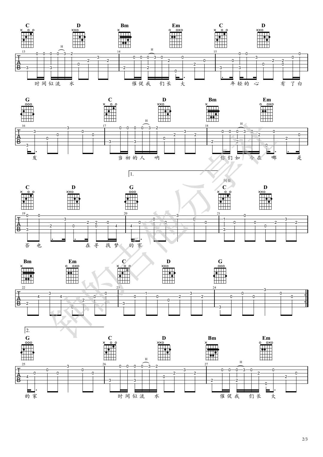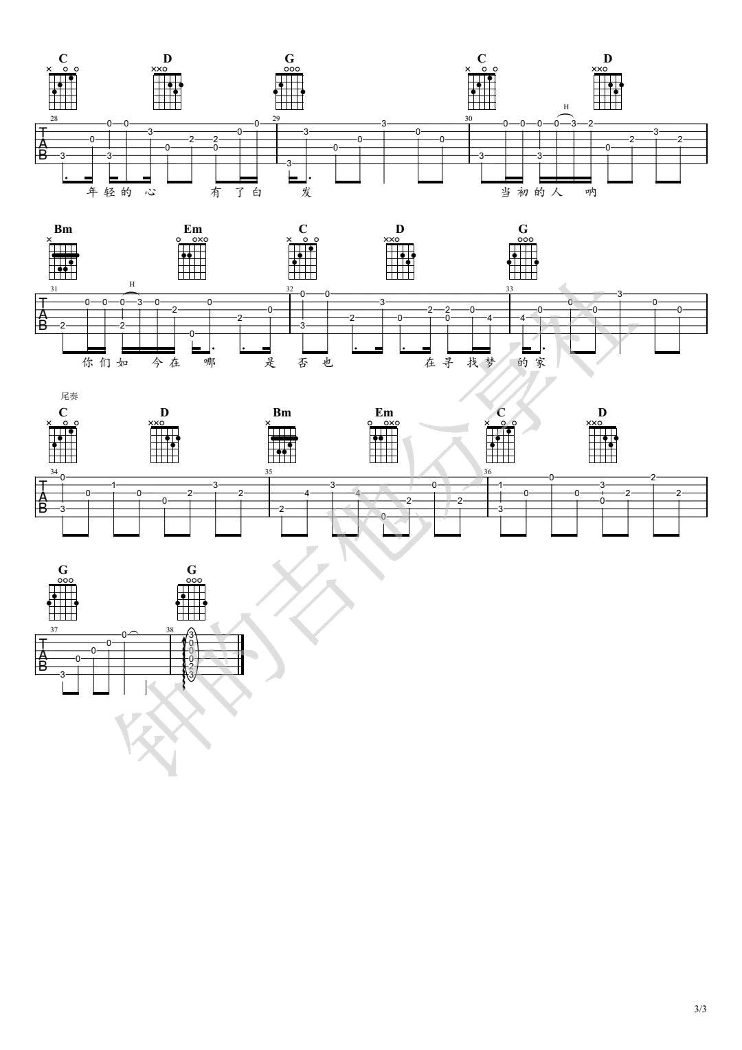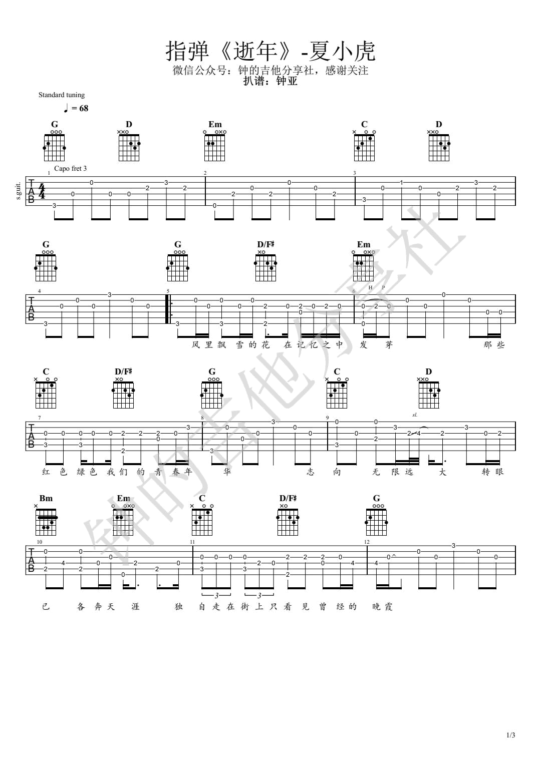 曲谱介绍: 逝年指弹吉他谱,改编自夏小虎的一首让人沉静的民谣歌曲。逝年吉他独奏谱,三张图片谱例。感谢钟的吉他分享社编配分享,琴谱网整理上传。 歌曲原调降B调,变调夹加3品,G调指法编配。G调和弦:G-Am-Bm-C-D-Em-#Fdim(或者D7);这首歌主要和弦走向:C-D-Bm-Em-C-D-G;和弦级数走向即:4-5-3-6-4-5-1,副歌常用和弦走向。