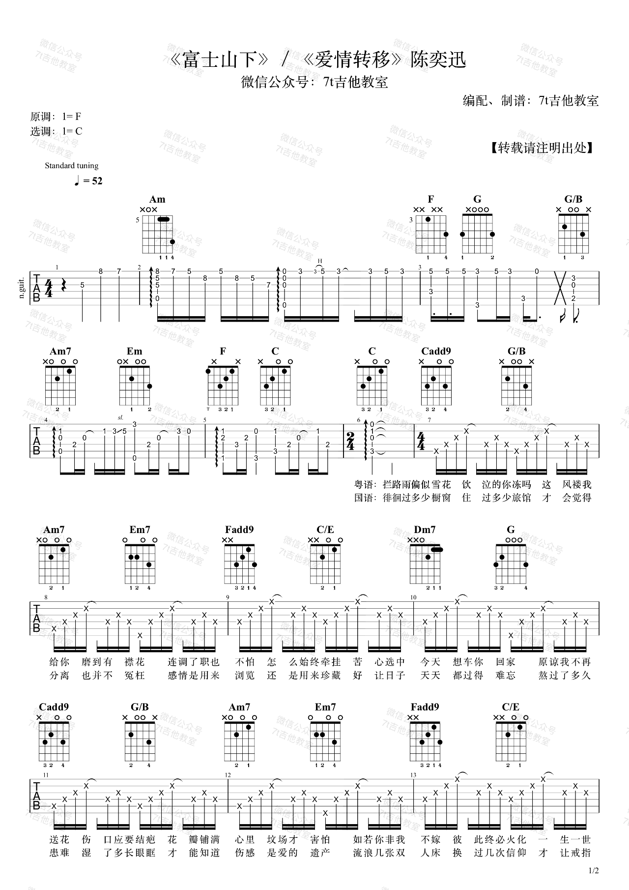 曲谱介绍: 富士山下吉他谱,陈奕迅的一首经典粤语歌曲,国语版本《爱情转移》吉他弹唱谱,这首歌的原调是F大调,我用的是C大调的指法来编配(视频里是标准音调弦,变调夹夹1品)。如果想弹原调,需要夹5品哦。 7T吉他教室和弦分析:首先基本的和弦色彩方面,一级和四级用了add9;五级用了4/5;二级、三级、六级用了小七……主歌部分基本上是一个很常用且经典的卡农走向,其中用了很多斜杠和弦使得低音部分有了更顺畅的连接,如果把 Am7 → Em7 → Fadd9 里的Em7替换成Am7/G也是很好听的,这样的话低音部分就全部以下行的方式串联起来了,不过由于我觉得用三级会比较符合原曲的编配,所以就用了Em7。歌曲里有两个副属和弦,一个是二级D7或其转位D7/F#,另一个是三级的转位E/G#,一般二级、三级、六级由原来的小和弦属性变为大和弦,很多时候都是因为用到了副属和弦的原理。歌曲的最后还用了升四级半减七 F#m7-5,不过这首歌里面会稍微有点变化,在六级和升四级之间多了一个二级属七,其实D7与F#m7-5的构成音极其类似,可以把它们当成一个整体去看待,D7的组成音是(D,F#,A,C);而F#m7-5的构成音是(F#,A,C,E),只有一个音不同,而且这两个和弦的色彩效果大部分来自于F#和C这两个音的减五度音程,其它音的影响并不大,因此这两个和弦可以看作是升四级用法的一个延伸变化,不过这种其实并不多见,大家当作个例来学习积累就可以了~