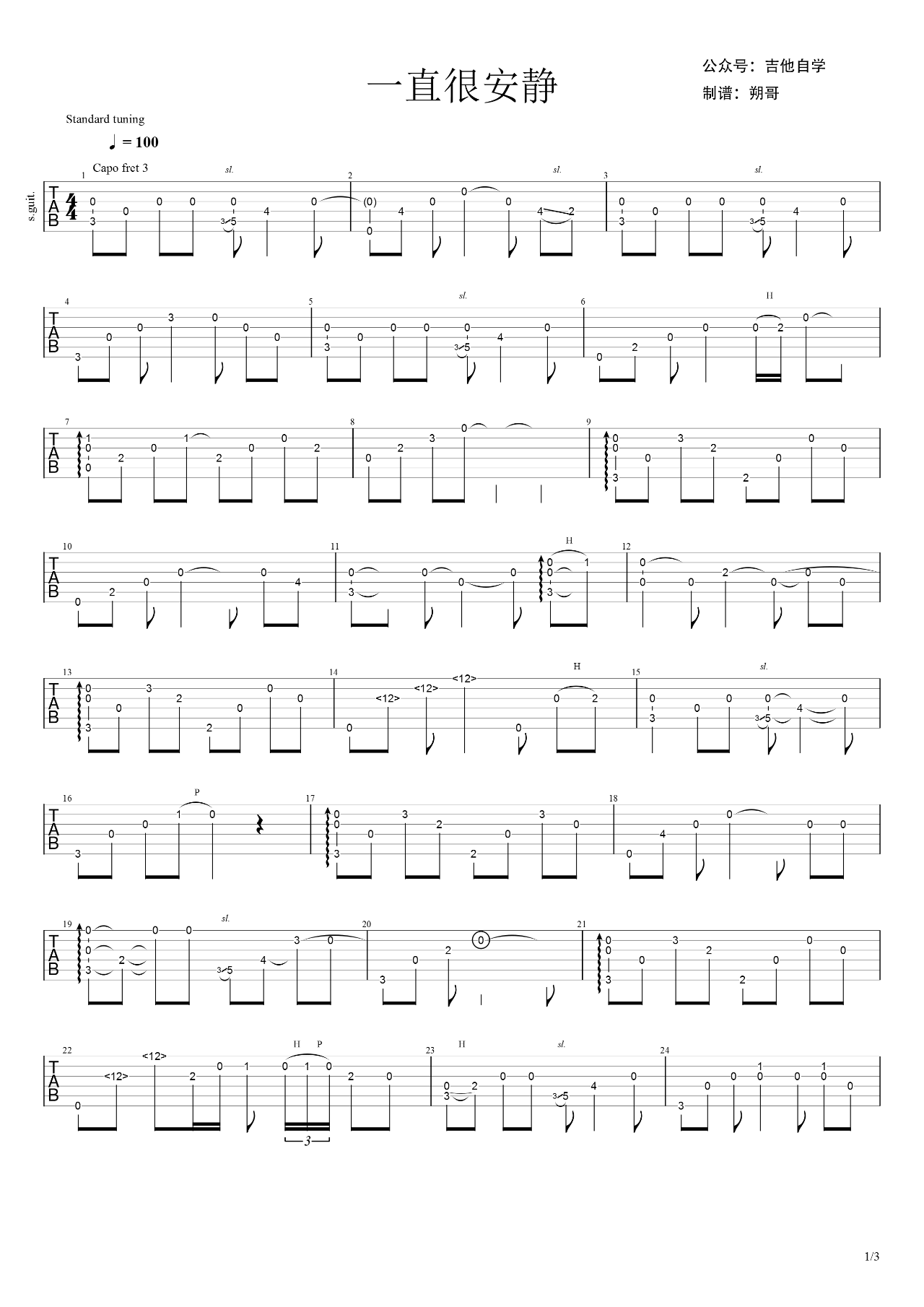 曲谱介绍: 一直很安静吉他指弹谱,电视剧《仙剑奇侠传》主题曲,阿桑的一首经典歌曲改编。一直很安静吉他独奏谱,C调,CAPO夹三品,三张高清图片谱,朔哥编配琴谱网整理上传。 演奏提示:曲子用到了大量的击勾弦滑音、琶音和自然泛音技巧,注意每个小节之间的时值把握、三连音的处理。