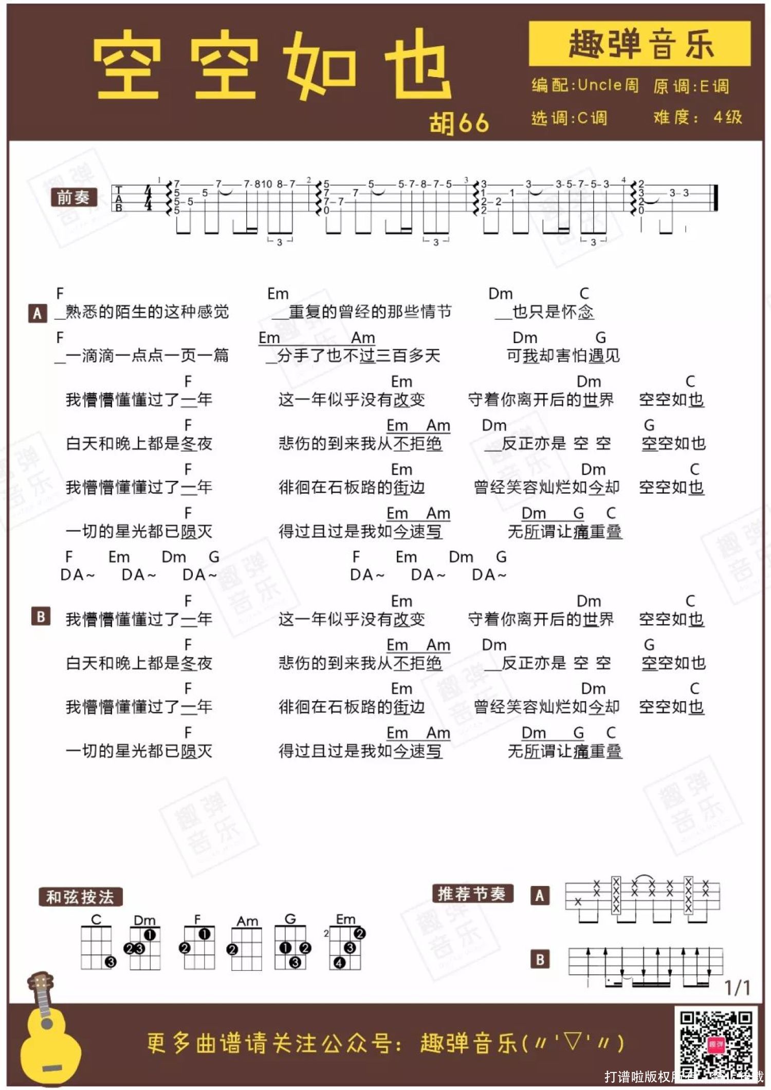 曲谱介绍: 空空如也 尤克里里谱   最近小编被一个声音醇厚低沉的女孩子迷住了,她唱的一首《空空如也》,洒脱节奏让小编单曲循环得停不下来。 这个小姐姐叫做胡66,是酷狗的一位人气主播。我承认最开始是被她的美貌吸引,但后来点开音乐,她只唱了一句,我就把这首歌列入了我的冬夜私藏歌单。 这首《空空如也》有两个版本,都十分好听。任然演唱的版本清澈柔和;今天小编介绍的胡66演唱的版本,则多了一丝成熟淡漠的韵味。 胡66低沉的声线与《空空如也》淡漠洒脱的旋律相搭配,一下子就戳中了很多人的心。歌词中唱的是与对方分开一年后还未走出阴影的自己,回忆着往事,心里空空如也。 反复被哼唱的“一年”和“冬夜”,让这首在2017年底发布的歌曲十分应景,有相似经历的人一听就有很强的代入感。 把心全部掏空,其实是为了重新填满。或许在一个人的冬夜里,这首《空空如也》能让你最后回忆一次过去,然后让放空的心勇敢地重新开始。