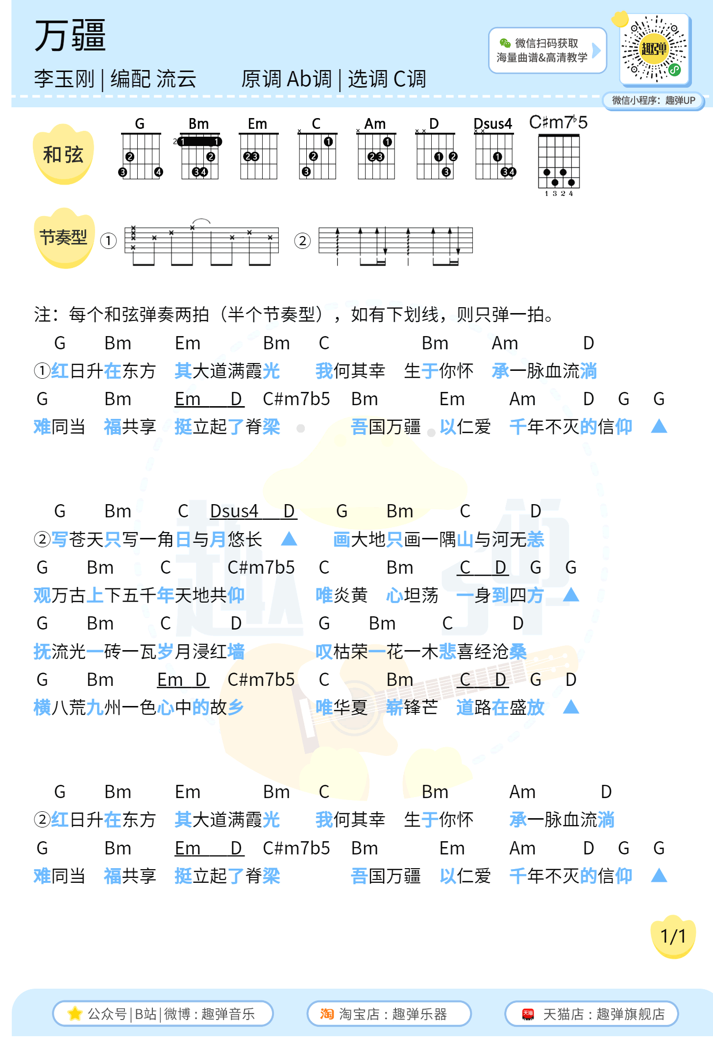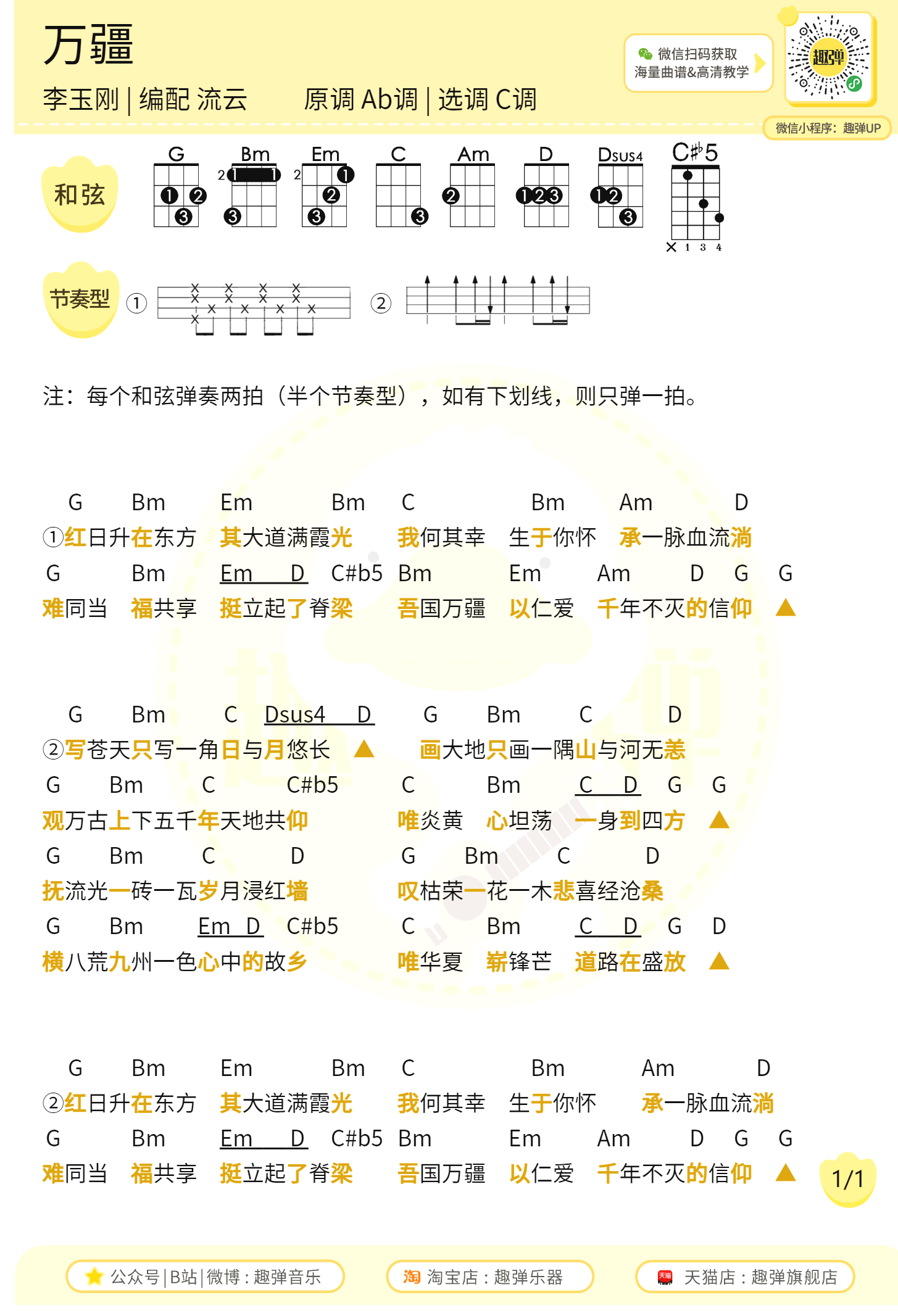 曲谱介绍: 万疆吉他谱,李玉刚演唱,这首歌是为庆祝中国共产党建党100周年发起的一首国风作品。万疆吉他弹唱谱+尤克里里谱,原调Ab,选用C调,两张图片谱。感谢趣弹音乐编配出品,琴谱网整理更新。
