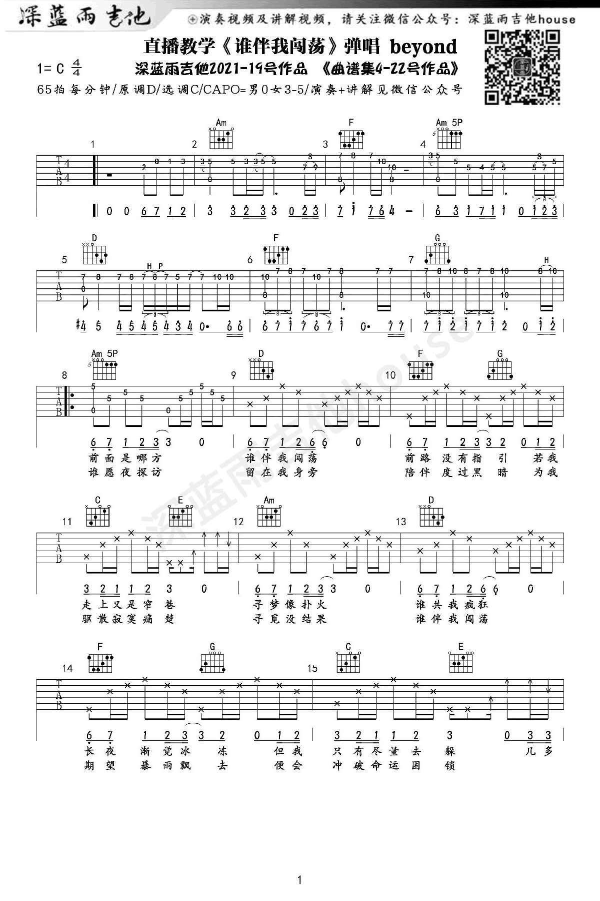 曲谱介绍: 谁伴我闯荡吉他谱,Beyond演唱,一首经典粤语歌曲,谁伴我闯荡吉他六线谱,原调D选调C,变调夹男生不夹,女生3-5品。三张图片谱+弹唱视频。感谢深蓝雨吉他出品,琴谱网上传。