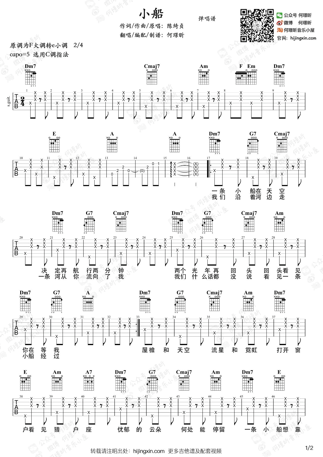 曲谱介绍: 小船吉他谱,陈绮贞的一首歌曲,浓浓的奇幻乐风,仿佛一出华丽的音乐剧,童话般的旅程,既温暖又悲伤。小船吉他六线谱,原调为F大调转e小调,选用C调指法,CAPO夹五品,两张弹唱图片谱。感谢何璟昕老师编配制谱分享,琴谱网整理上传。 到底是天空的小船,还是海上的小船,还是心里的小船? 陈老师新歌里面最喜欢这首了,弹唱演示视频在海边拍的,三拍子加间奏的半音简直太喜欢,于是模仿原版用midi做了一个手风琴间奏。