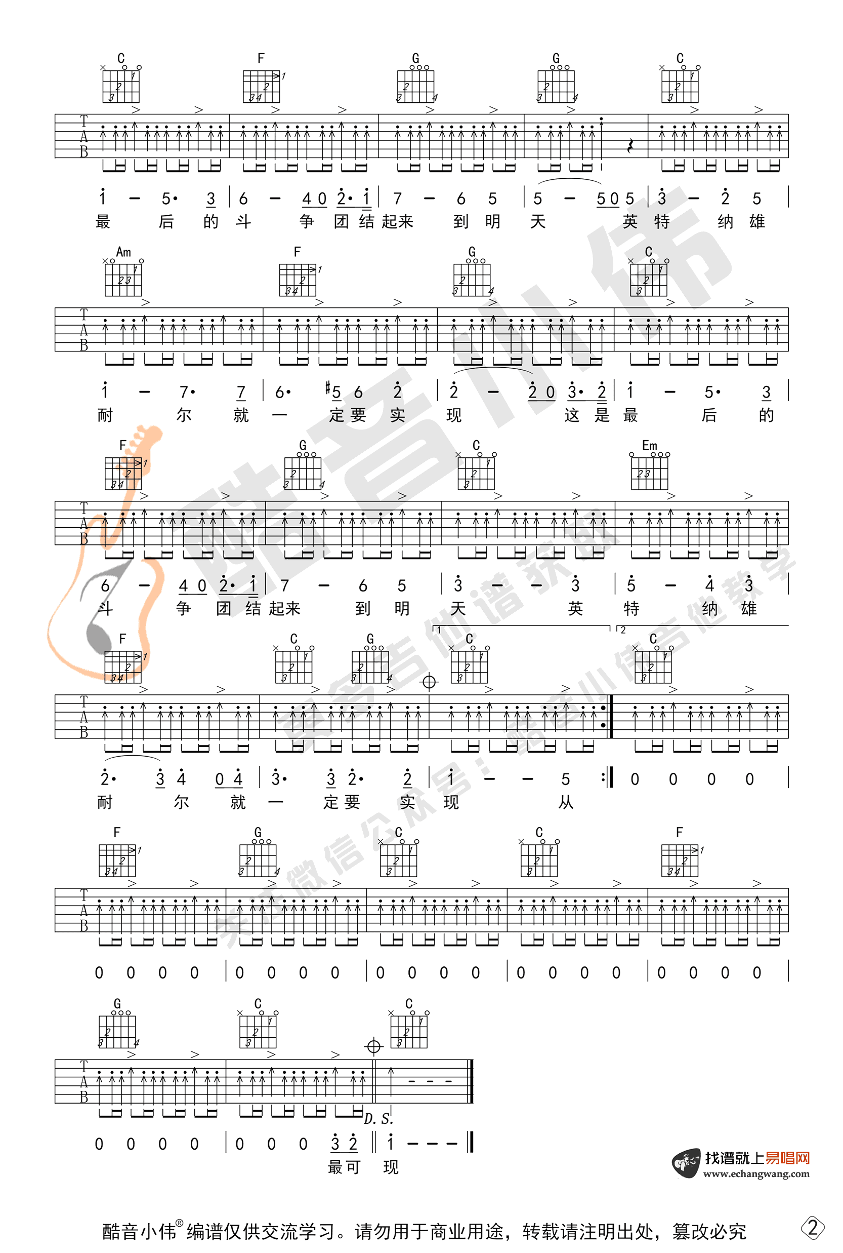 曲谱介绍: 国际歌吉他谱,一首让人斗志昂扬的国际共产主义歌曲。国际歌六线谱,根据唐朝乐队的演唱版本改编。原调G选调C,变调夹位置推荐,男生0-2品女生3-5品,两张高清图片谱。酷音小伟编配出品,大家可以跟着老师的视频教学分小节逐步学习,琴谱网整理上传。
