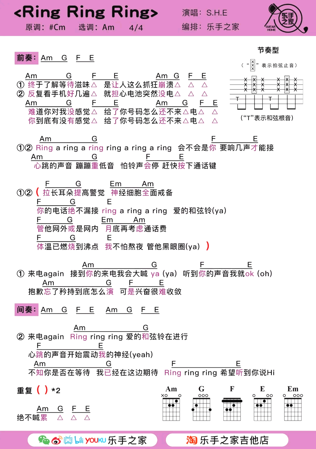 曲谱介绍: Ring Ring Ring吉他谱,SHE的演唱的一首非常可爱的歌曲,唱出情窦初开的恋爱情怀。Ring Ring Ring吉他弹唱谱,为琴友们送上两个和弦版本,图片谱由岛屿吉他和乐手之家编配分享,琴谱网整理上传。