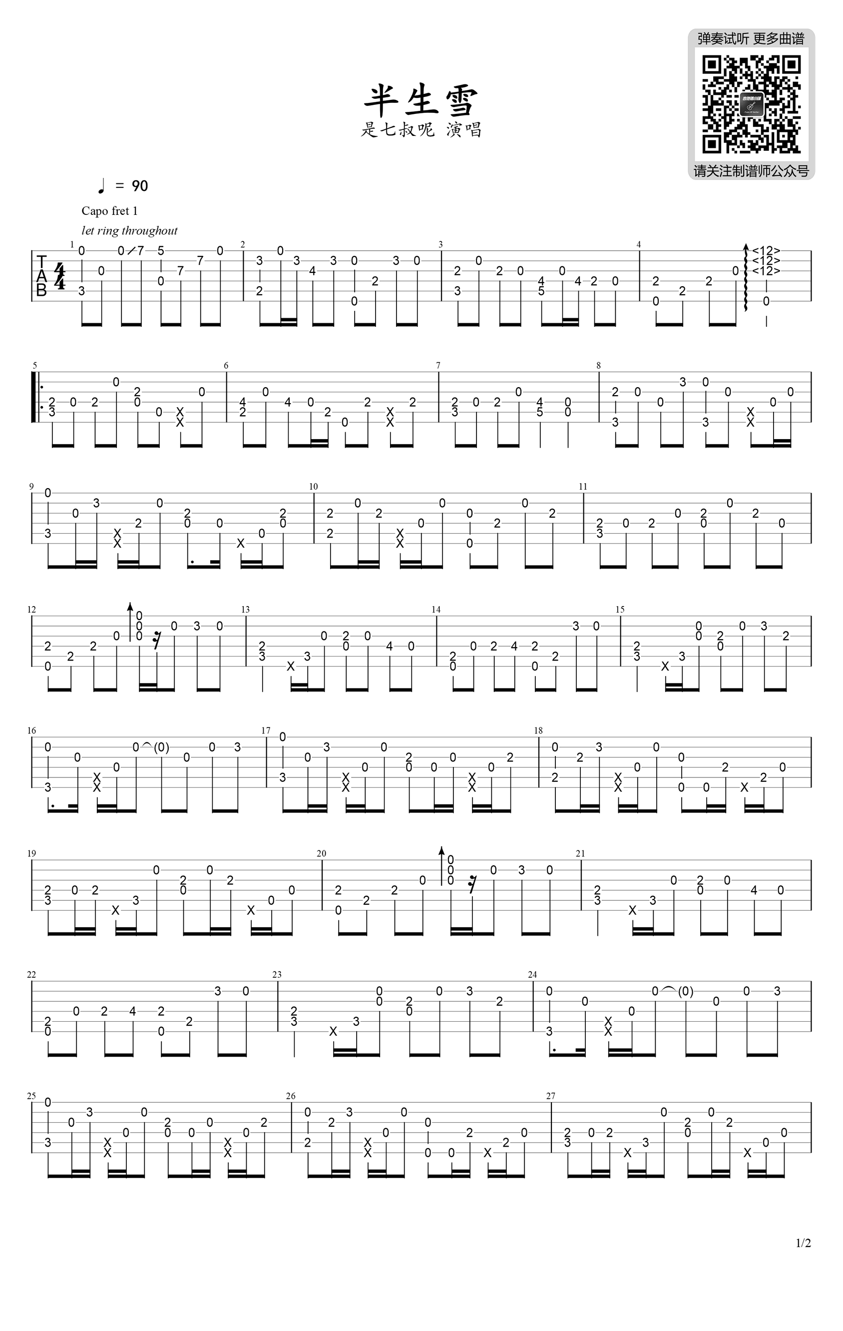 曲谱介绍: 半生雪指弹吉他谱,改编自是七叔呢的一首热门古风歌曲。半生雪吉他独奏谱,简单版编配,两张图片谱。感谢卿是我呢出品分享,琴谱网更新上传。