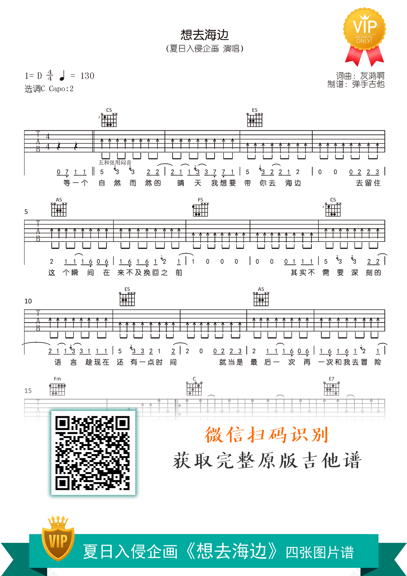 曲谱介绍: 夏日入侵企画的一首充满夏日青春气息的歌曲,想去海边吉他谱,原调D选调C,CAPO夹二品,想去海边吉他弹唱谱,完整编配共四张高清图片六线谱。琴谱网整理更新。