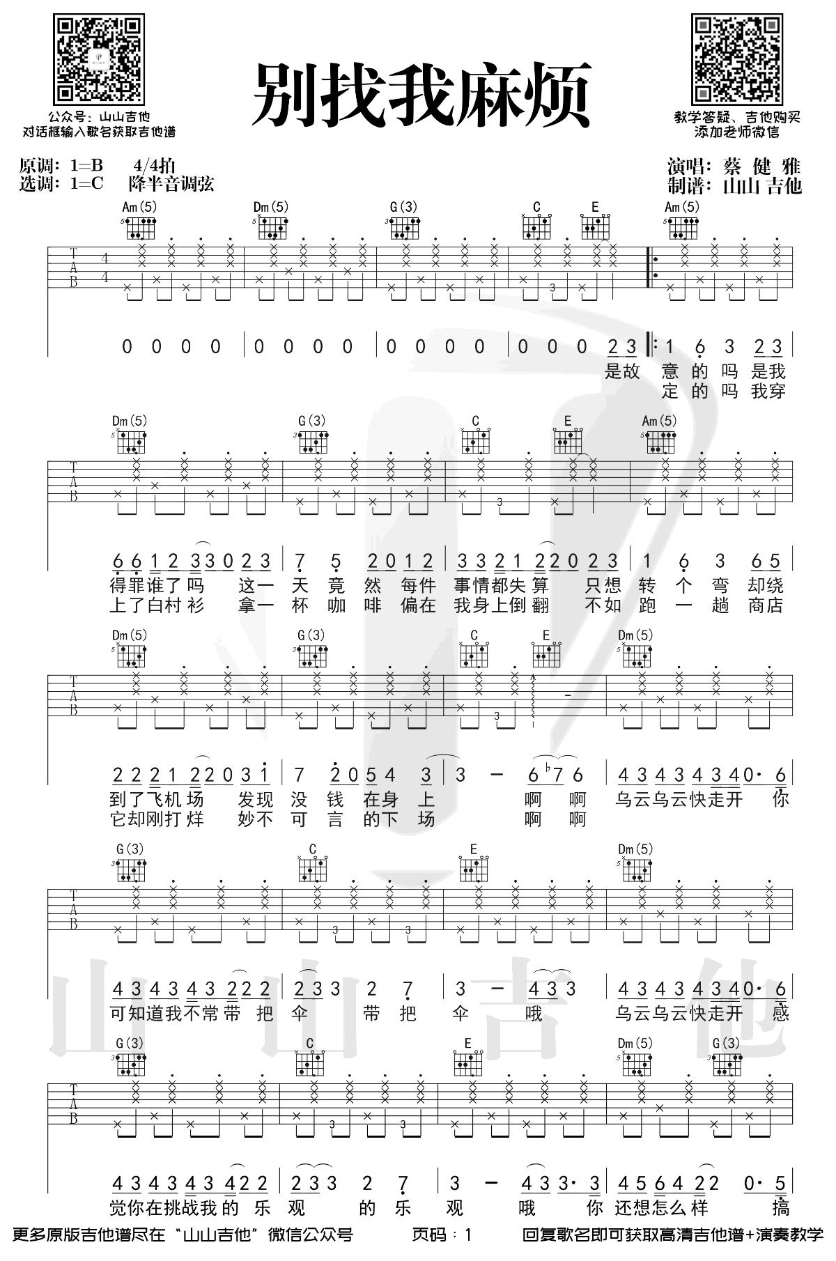 曲谱介绍: 别找我麻烦吉他谱,蔡健雅演唱的一首慵懒而充满韵律的洗脑歌曲。原调B选调C,降半音调弦。别找我麻烦吉他弹唱谱,两张图片六线谱。琴谱网更新上传,感谢山山吉他制谱分享。 这是一首小调歌曲,因为使用了制音技巧,让歌曲显得更俏皮,增强旋律的跳跃感。附上吉他弹唱演示视频,琴友们跟随老师示范练习起来。