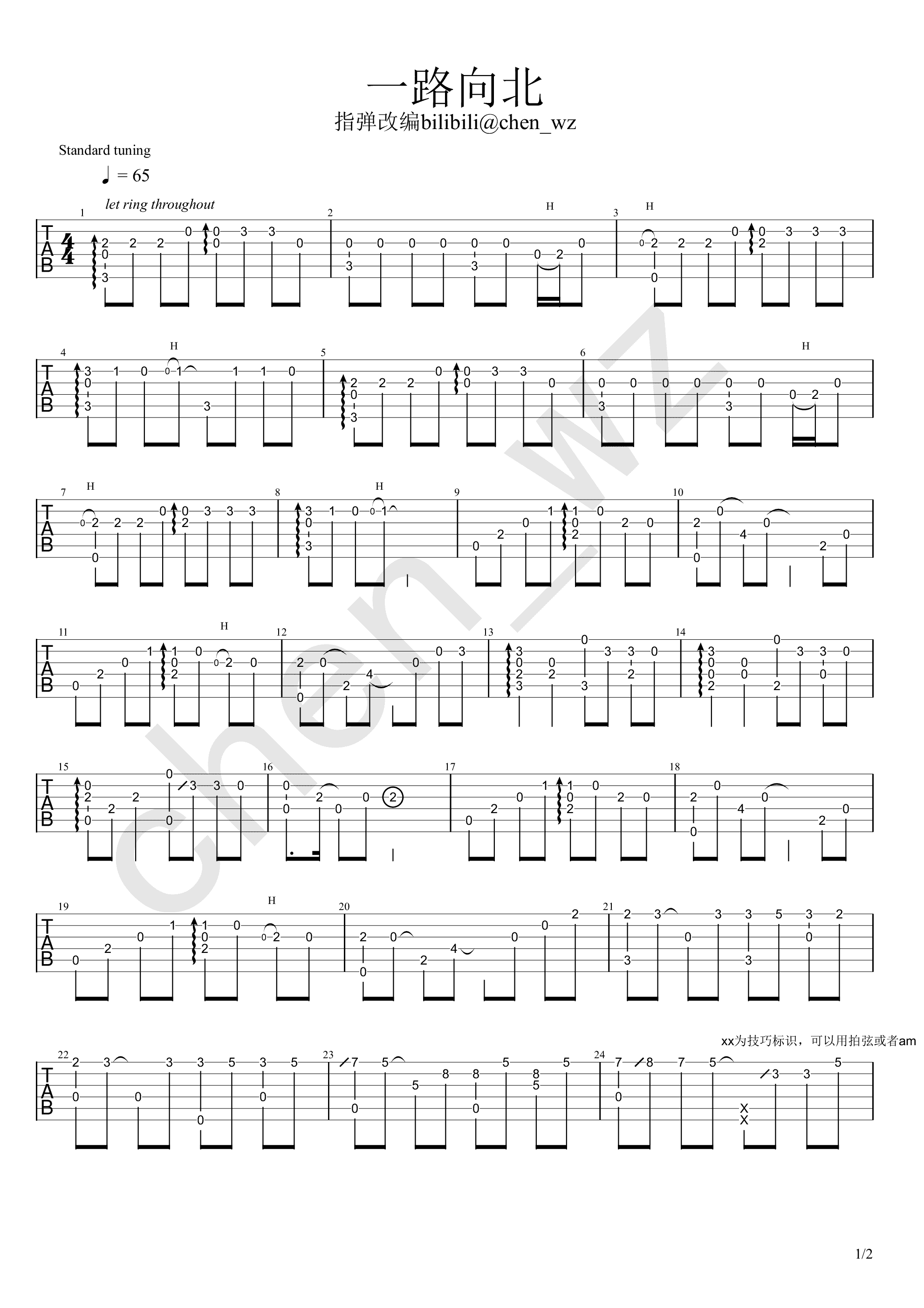 曲谱介绍: 一路向北指弹吉他谱,改编自周杰伦演唱的电影《头文字D》主题曲。一路向北吉他独奏谱,新手向编配,随谱附上一路向北吉他指弹演示视频,琴友们参照练习。感谢Chen_wz出品,琴谱网更新上传。