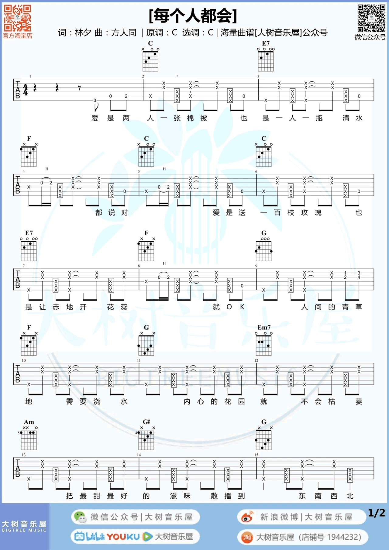 曲谱介绍: 每个人都会吉他谱,方大同词曲演唱的一首清新R&B风格的歌曲。每个人都会六线谱,C调和弦编配,两张弹唱图片谱。感谢大树音乐屋编配分享,并同步曲谱配套吉他演示视频。