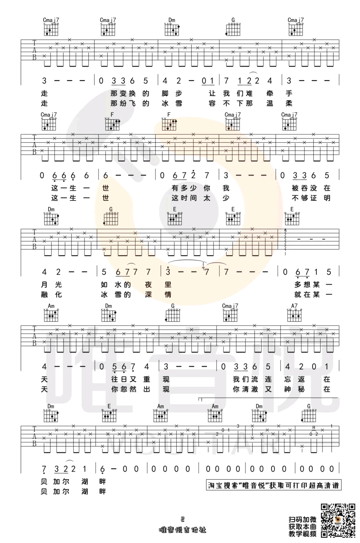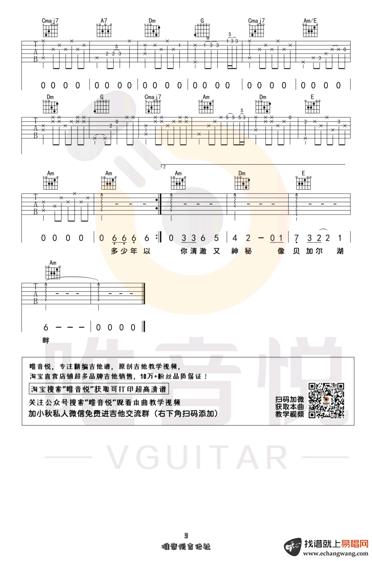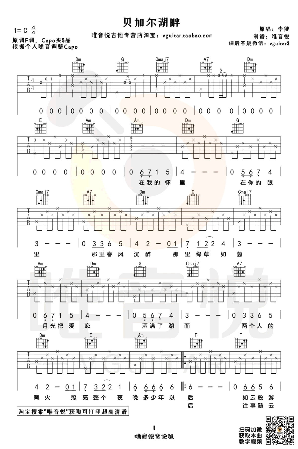 曲谱介绍: 贝加尔湖畔吉他谱,李健的一首美的让人沉醉的经典歌曲,适合吉他初学者学习。贝加尔湖畔六线谱,原调F,选用C调指法编配,CAPO夹五品,三张弹唱图片谱。琴谱网整理,唯音悦制谱分享。