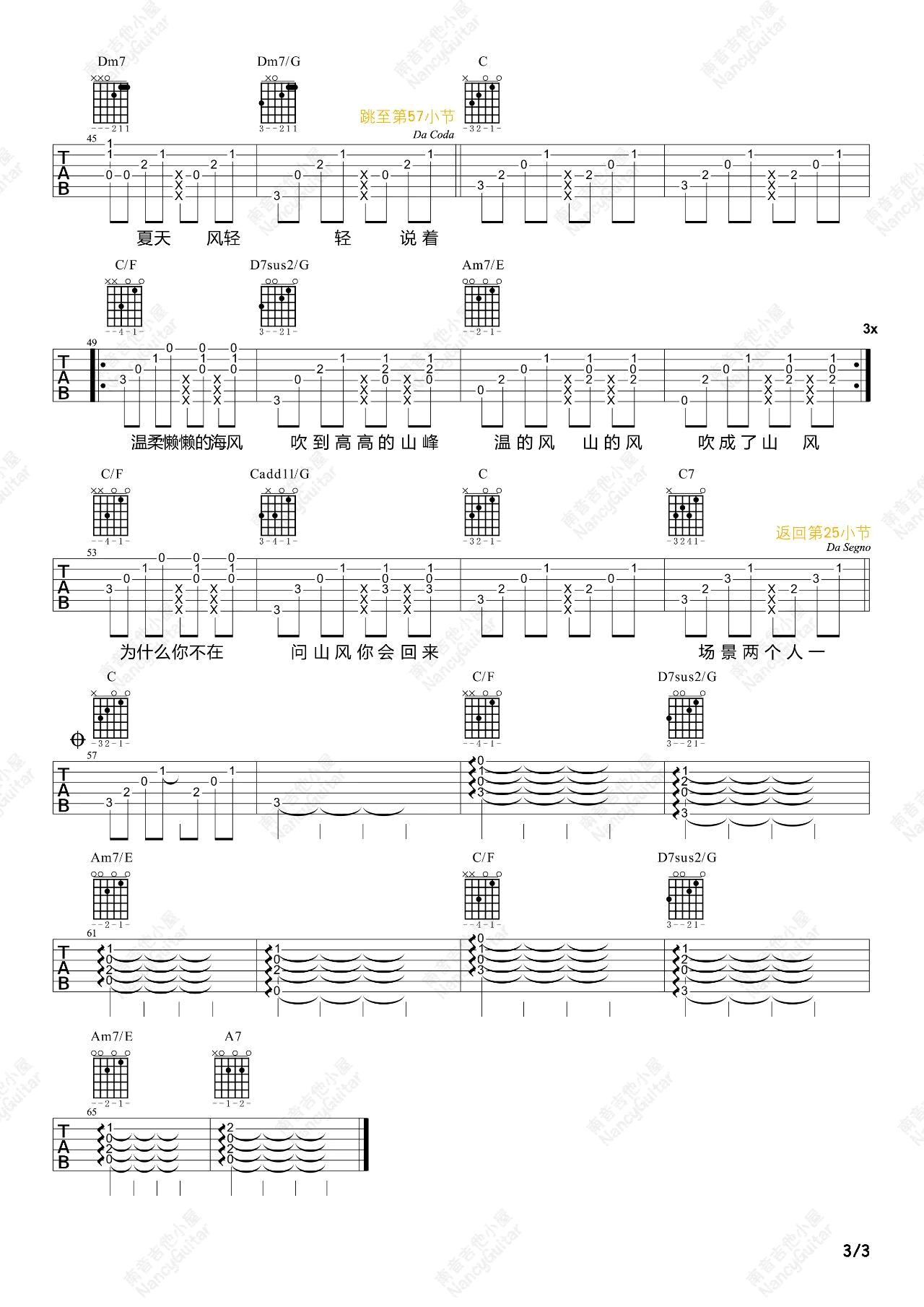 曲谱介绍: 夏天的风吉他谱,温岚演唱的一首经典代表歌曲,夏天的风六线谱,感谢NANCY老师带来曲谱配套吉他弹唱教学视频,琴谱网更新上传。 这首歌需要拍弦,曲谱中,数字代表正常拨弦,X代表拍弦,没有和弦之外的特殊音,所以左手只关注和弦图就可以了。右手节奏可以跟着教学视频练习,左手和弦不难,但有几对相近的和弦要注意细节,变调夹参考原歌夹二品,我夹一品,女生可以参考,男生根据自己嗓音调整,可能需要夹高一点。