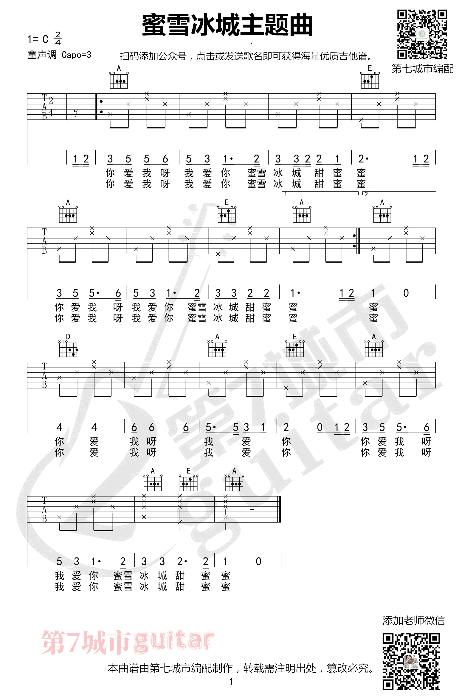 蜜雪冰城主题曲吉他谱 - 蜜雪冰城甜蜜蜜 - C调吉他独奏谱