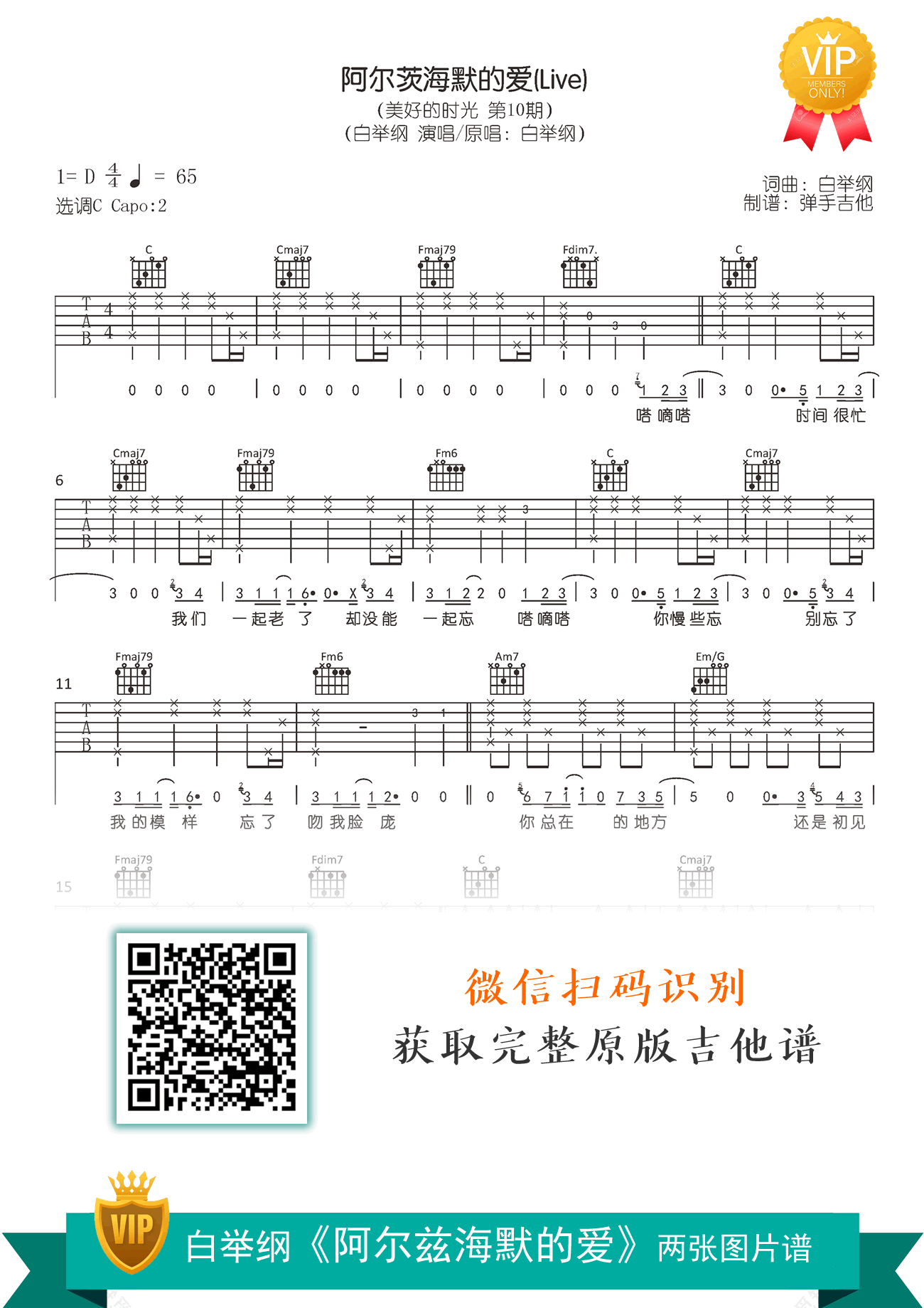 曲谱介绍: 阿尔兹海默的爱吉他谱,白举纲词曲创作原唱,王泓昊在《中国好声音》节目的深情演绎重新带火了这首歌。阿尔兹海默的爱六线谱,原调D选调C,变调夹夹第二品,两张高清弹唱图片谱。琴谱网更新上传。
