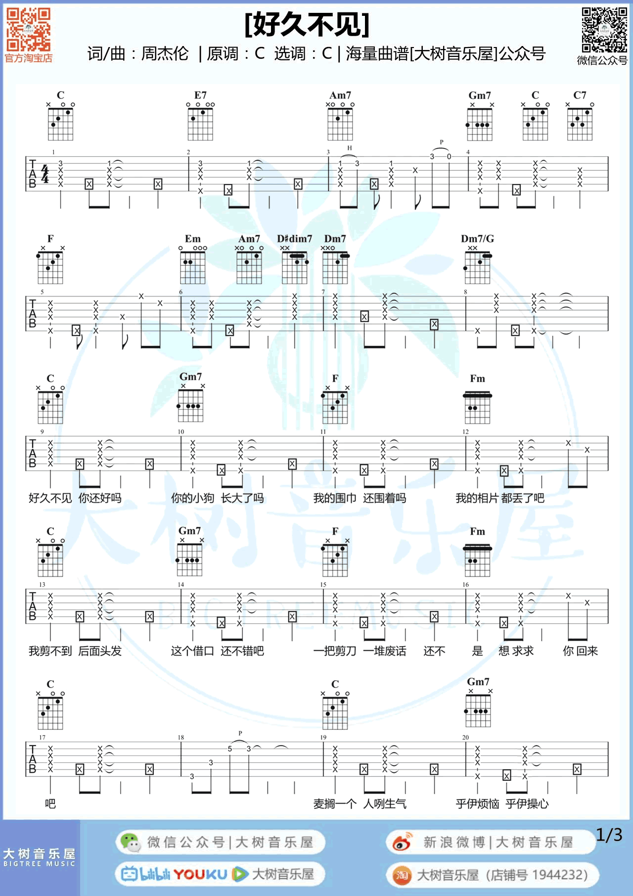 曲谱介绍: 周杰伦《好久不见》吉他谱,一首甜美轻快的情歌。好久不见六线谱,C调编配,变调夹女生可以选择夹3-4品,男生可以唱女调,不需要变调夹。三张图片谱。感谢大树音乐屋制谱出品,并带来吉他弹唱演示视频。
