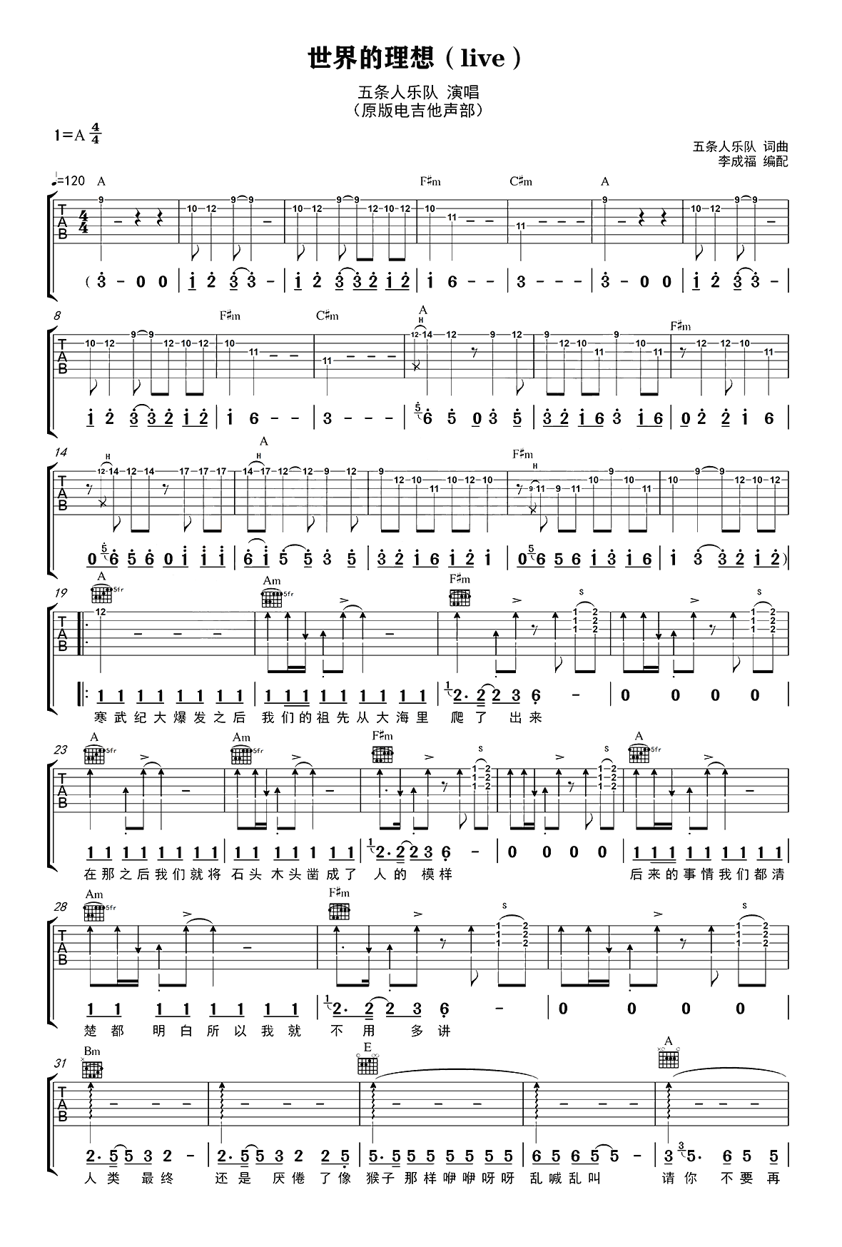 曲谱介绍: 五条人在乐夏2现场版《世界的理想》吉他谱,3张PNG格式高清图片六线谱,五条人乐队A调原版,李成福制谱。《世界的理想》LIVE版原版电吉他声部和弦谱,欢迎喜欢五条人歌曲的琴友练习。