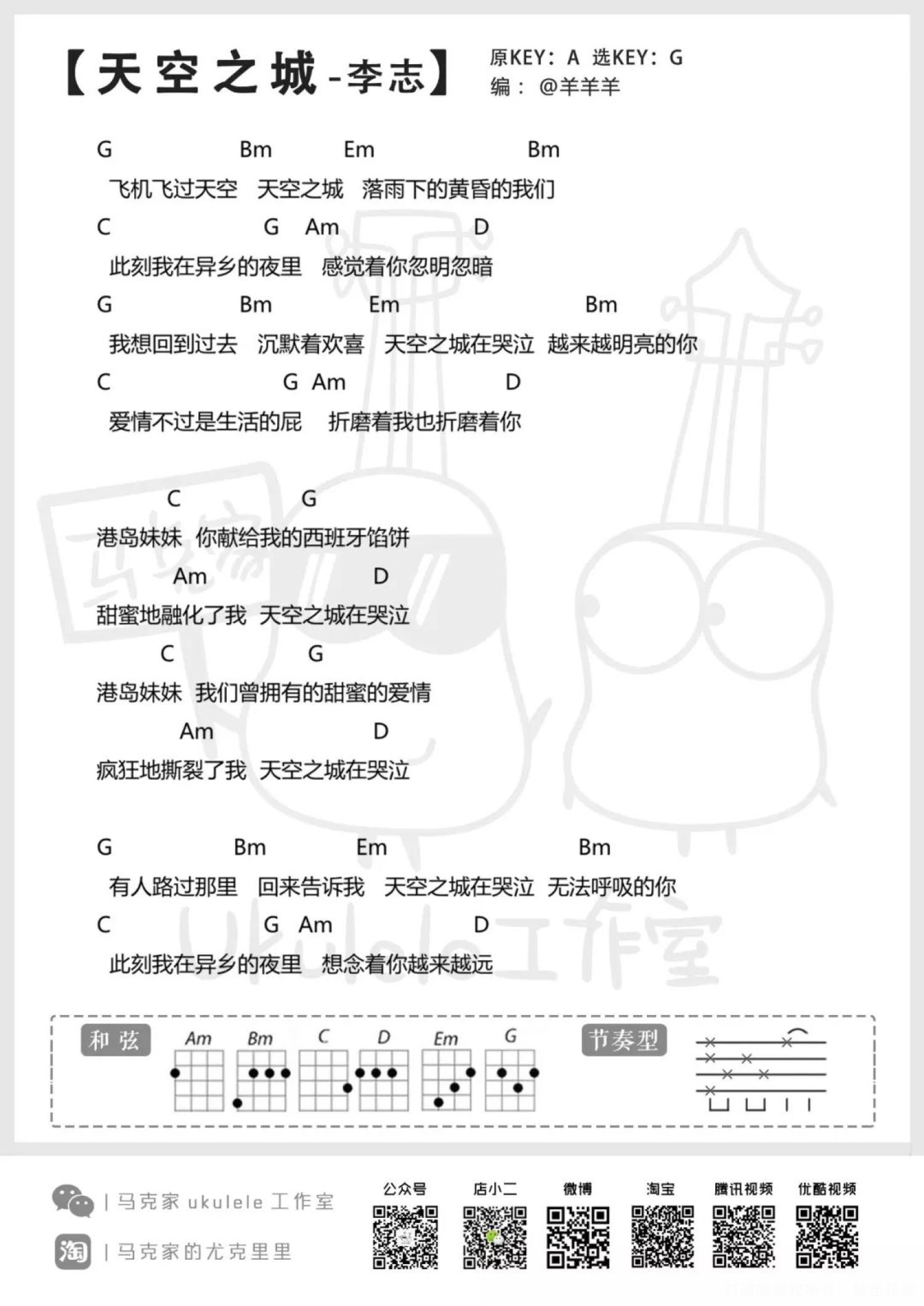 曲谱介绍: 这两天似乎还没从快闪中缓过神来,想睡睡不着,想起醒不来,昏昏沉沉了好久。 一直有好多些歌想给大家推荐,但是因为水平的因素诠释不好就一直没录,比如《连名带姓》《开不了口》《声律启蒙》《借我》等等。也有好多的节目想推荐给大家,比如《大事发声》《中国乐队》等等。所以你们自己去看自己去听吧。 过去的十二个月里发生了好多好多,以至于都不想再去想起。 我甚至连参加新歌声这件事都选择性忘记,可能脑子已经被七月份给吞噬了。 七月份的毕业演出,七月份的分开,这似乎是我整个后半年的毒药,怎么也解不了。 有想过离开马克家,有想过离开珠海,可却迟迟不愿下决心,或许不想离开音乐吧,虽然这借口很烂,但就当它是我不愿意走的唯一理由吧。 就像李志唱的,你献给我的西班牙馅饼,甜蜜的融化了我,我们曾拥有的甜蜜的爱情,疯狂的撕裂了我,天空之城在哭泣。 所有的甜蜜,在最后变成了灰,撒向蓝天,随风飘散。   /  视  频  演  示  /   cover by 羊羊羊     /  曲  谱  分  享  /
