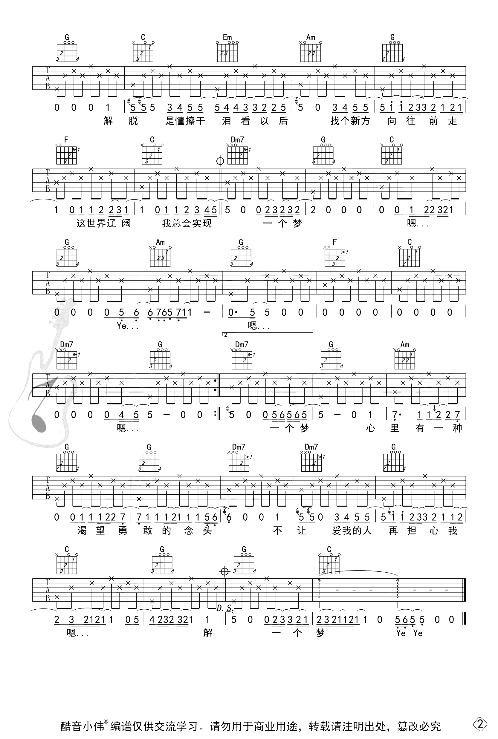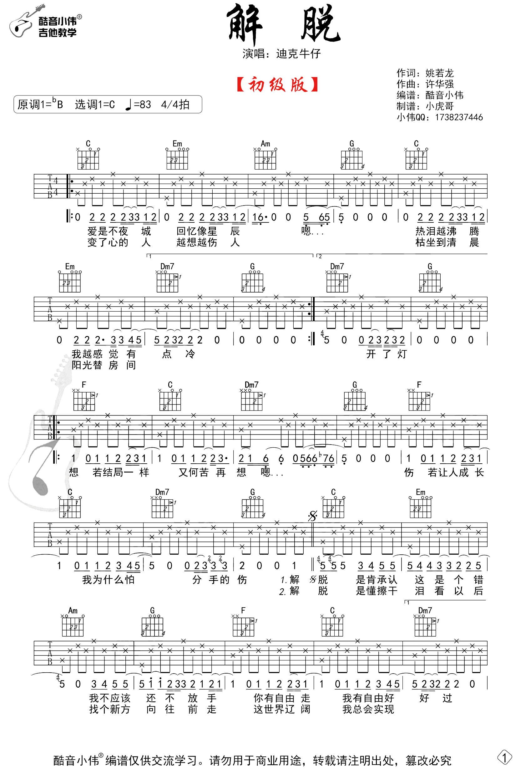 曲谱介绍: 迪克牛仔《解脱》吉他弹唱谱,采用C调指法编配,共有3张高清图谱。
