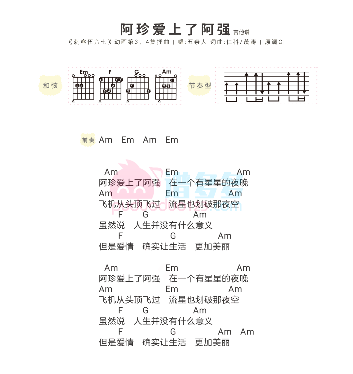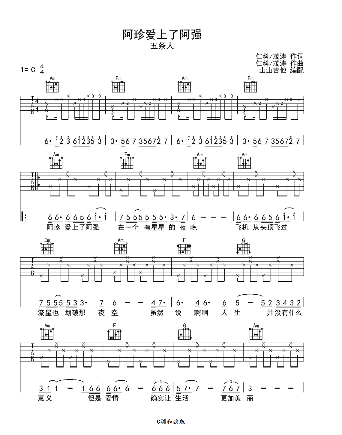 曲谱介绍: 五条人《阿珍爱上了阿强》吉他弹唱谱,采用C调指法编配,共有3张高清图谱。
