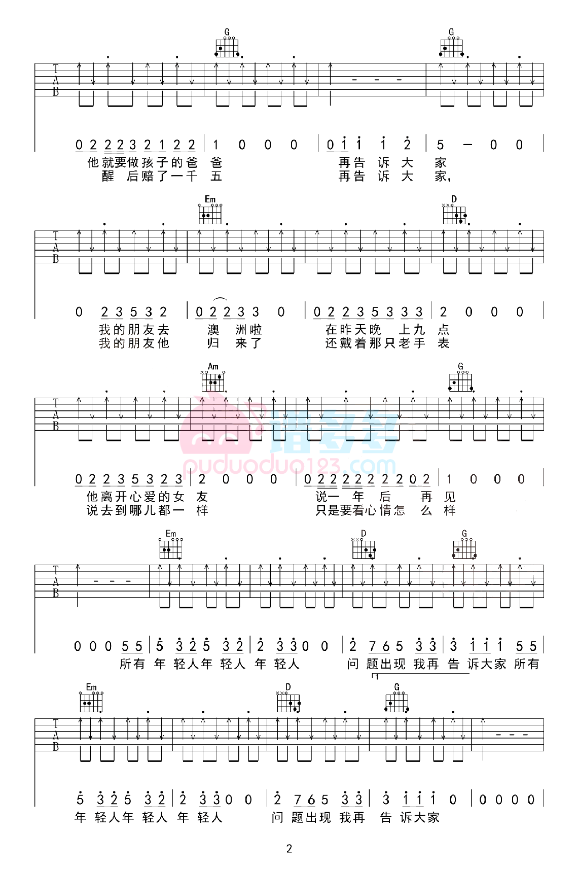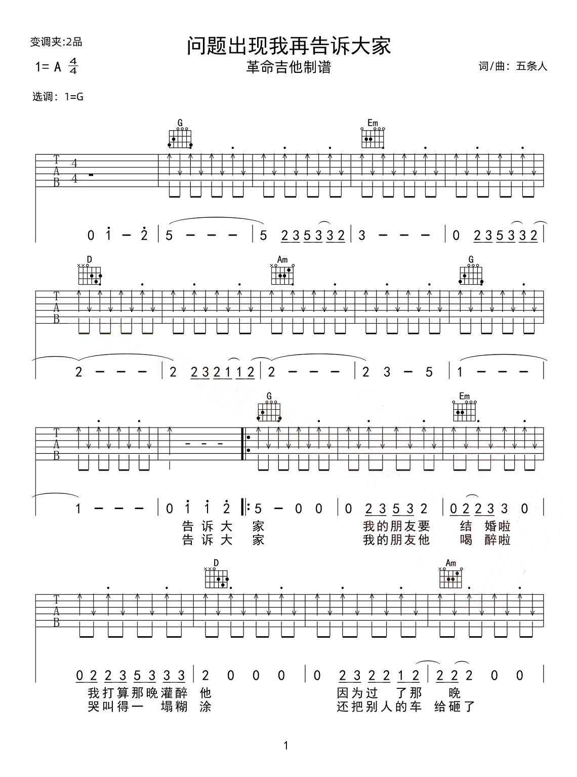 曲谱介绍: 五条人《问题出现我再告诉大家》吉他弹唱谱,采用A调指法编配,共有4张高清图谱。