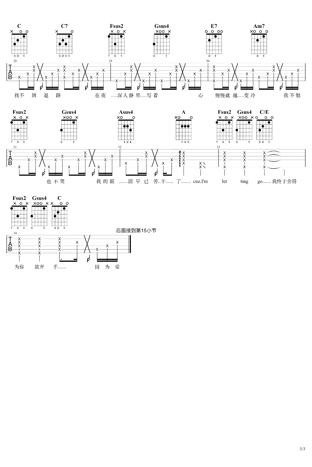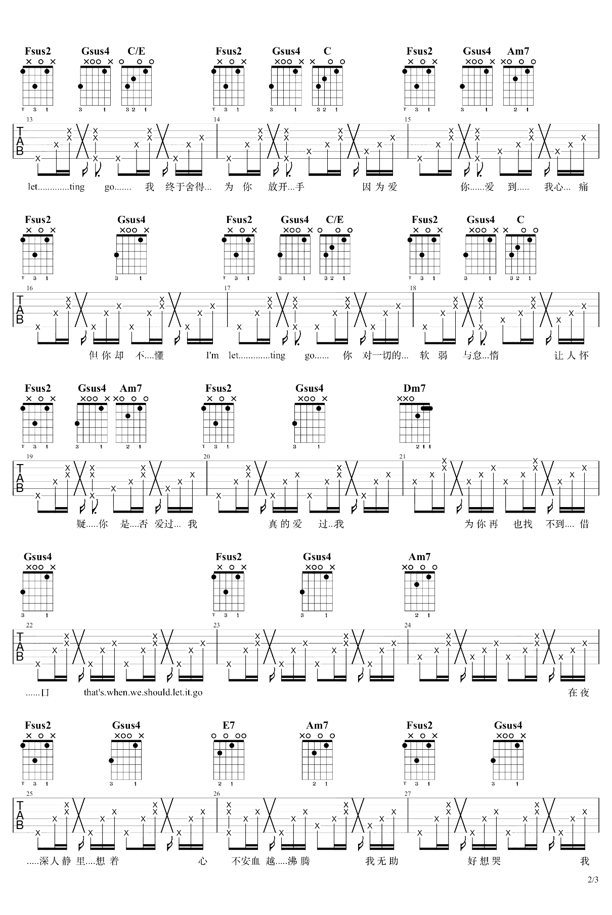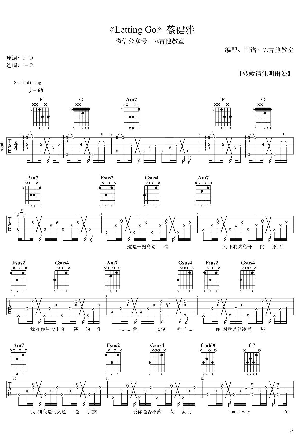 曲谱介绍: Letting《LettingGo》吉他弹唱谱,采用C调指法编配,共有4张高清图谱。