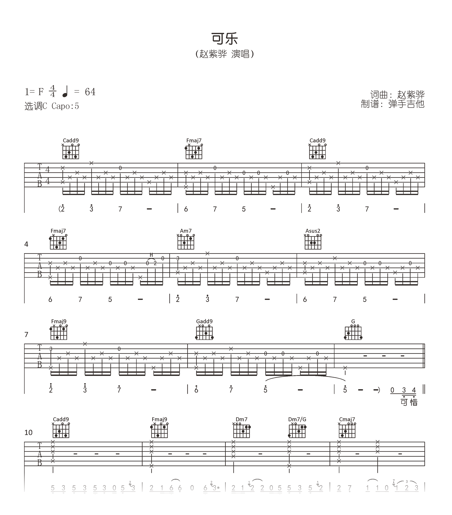 曲谱介绍: 赵紫骅《可乐》吉他弹唱谱,采用C调指法编配原版,共有2张高清图谱,免翻页排版设计。