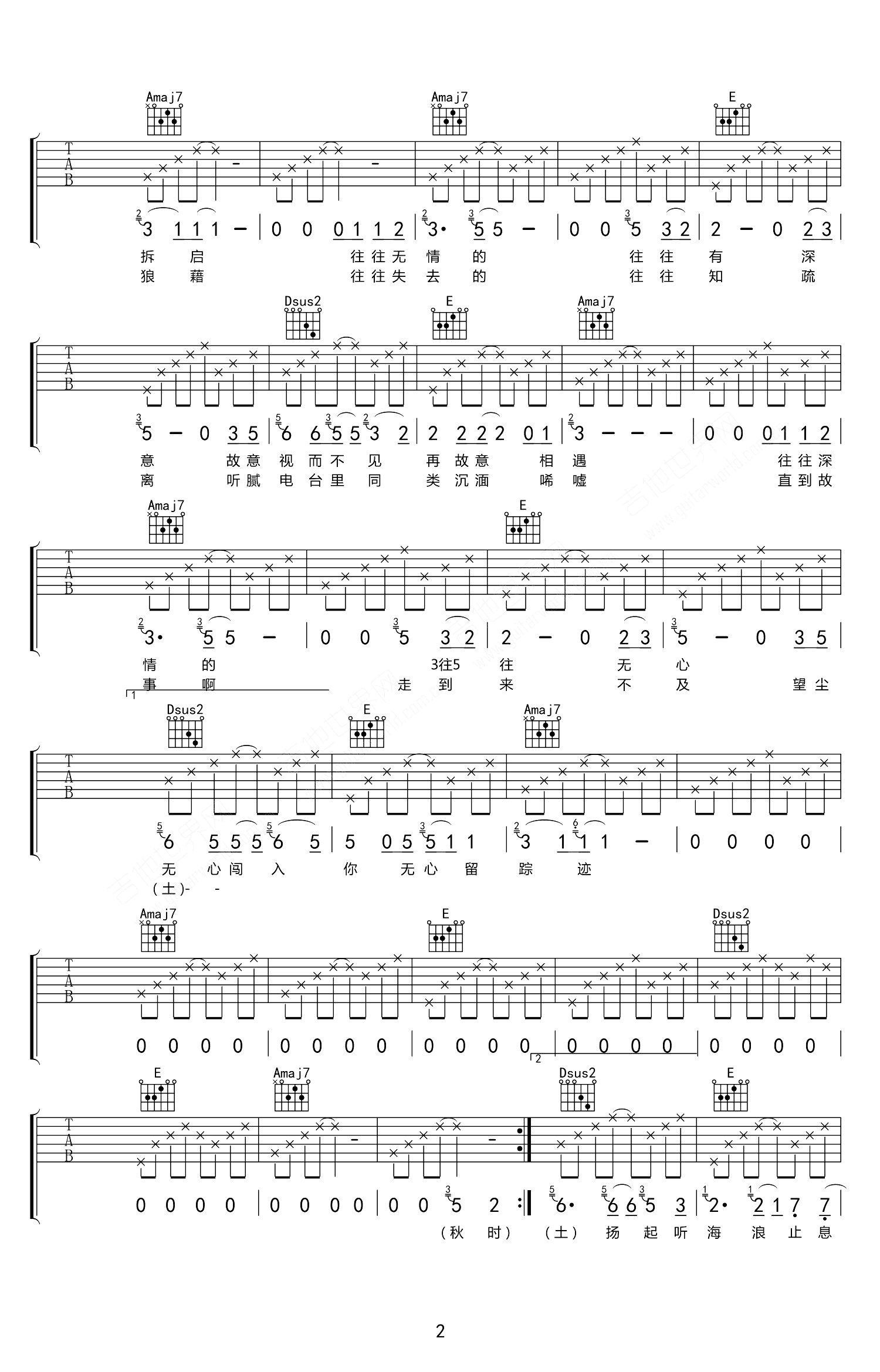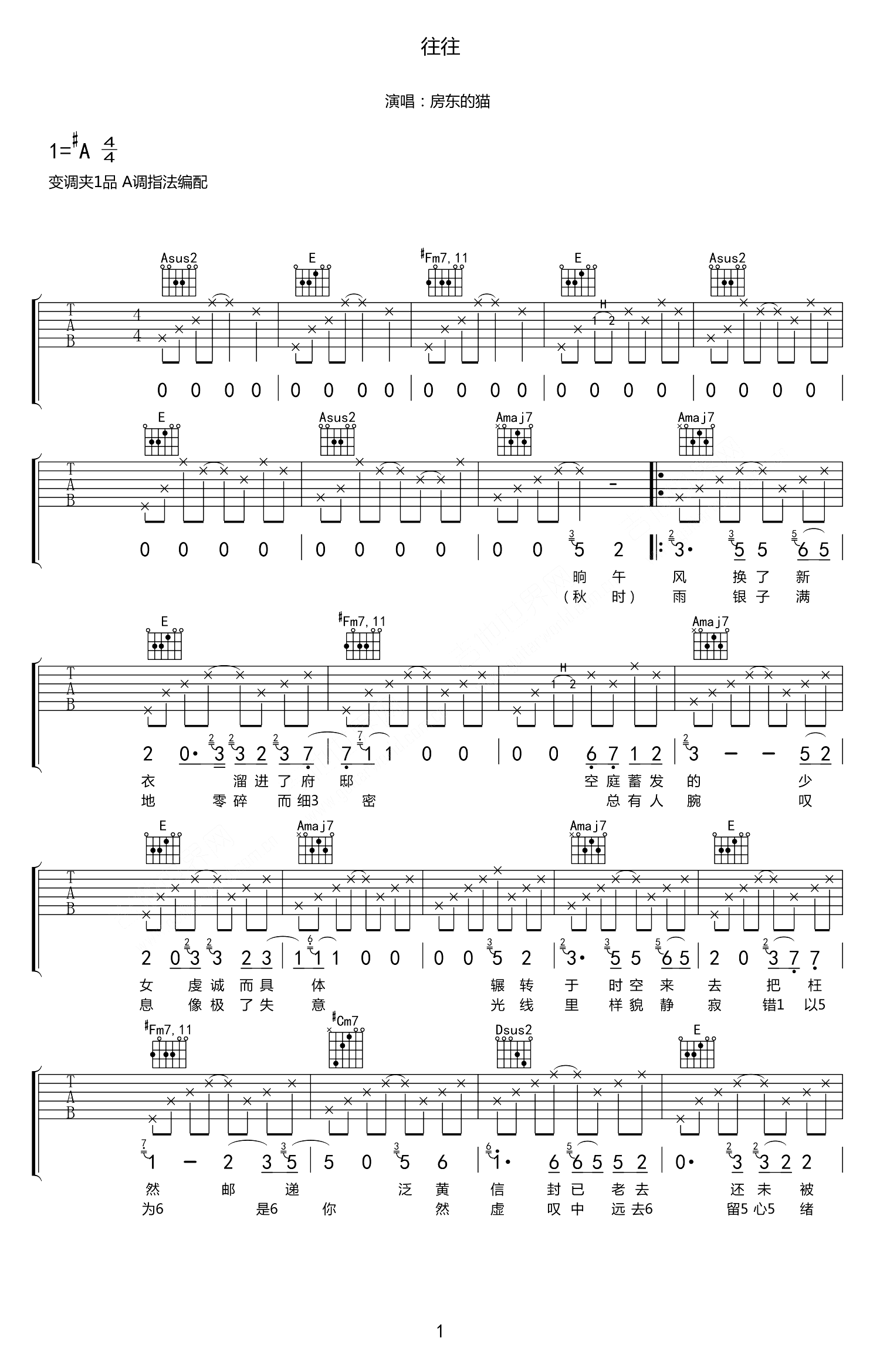 往往吉他谱 - 房东的猫 - A调吉他弹唱谱
