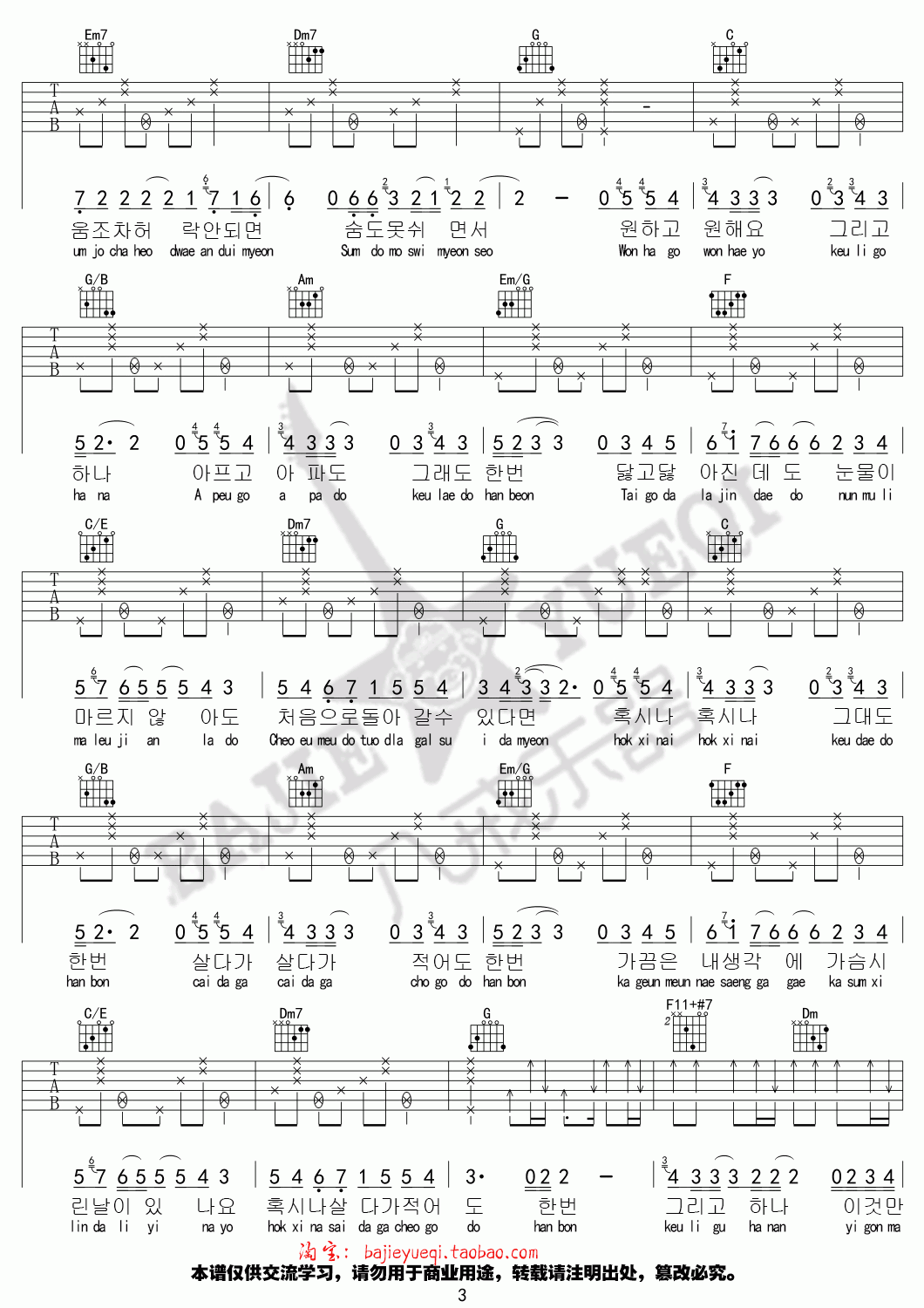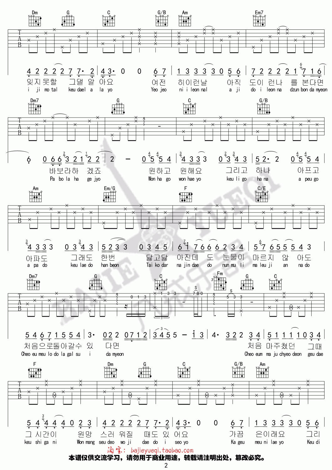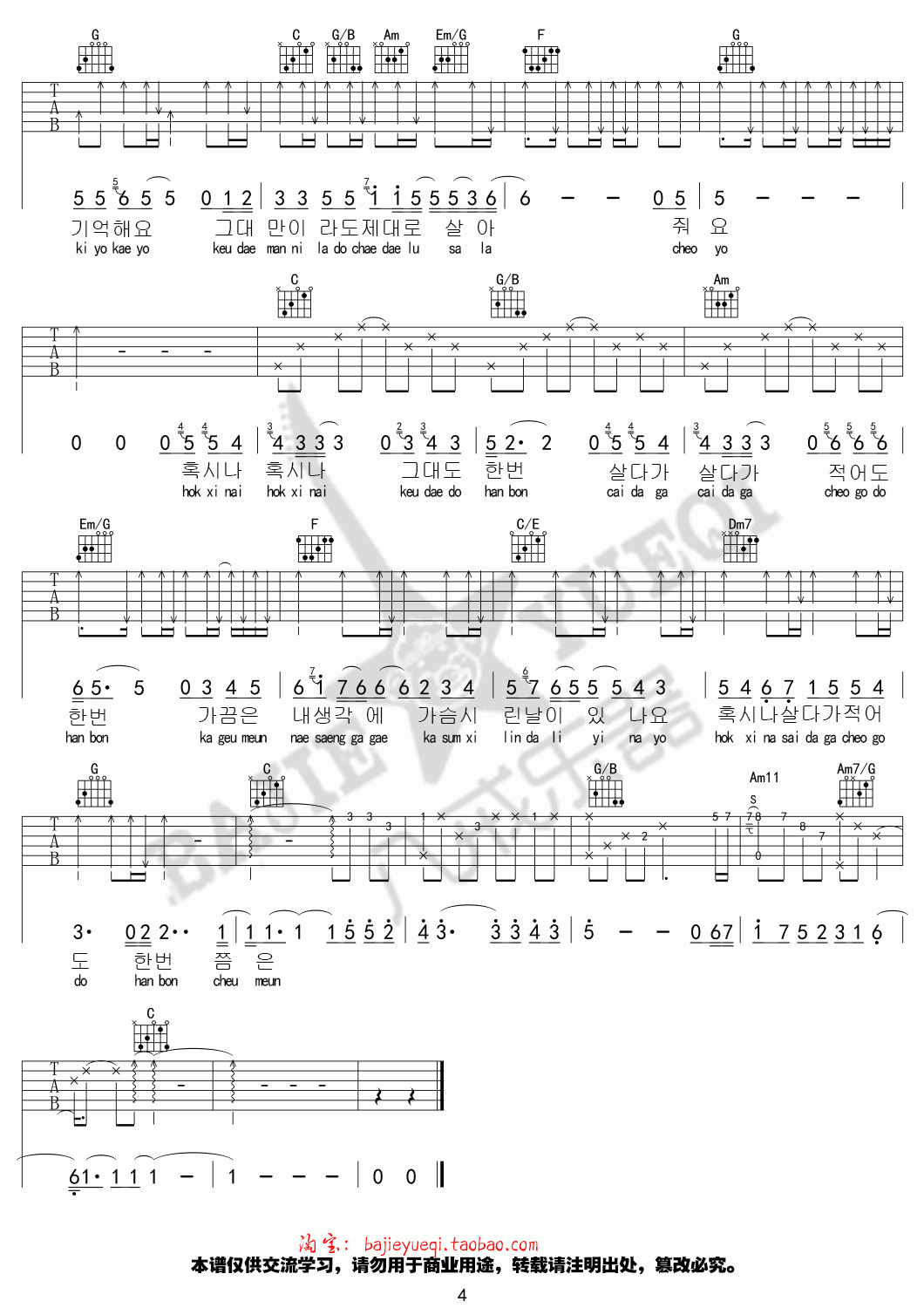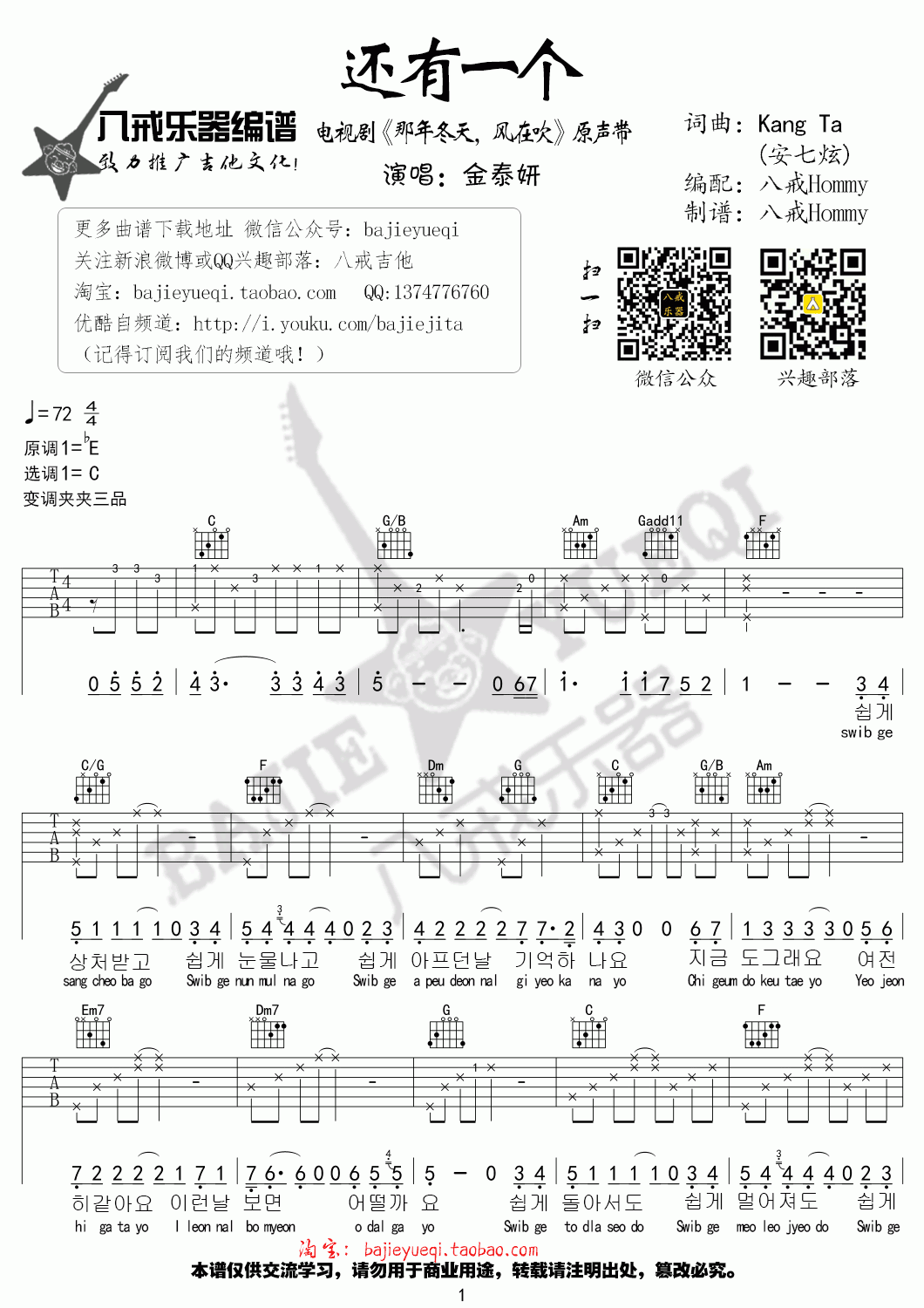曲谱介绍: 金泰妍《还有一个》吉他弹唱谱,采用C调指法编配,共有4张高清图谱。