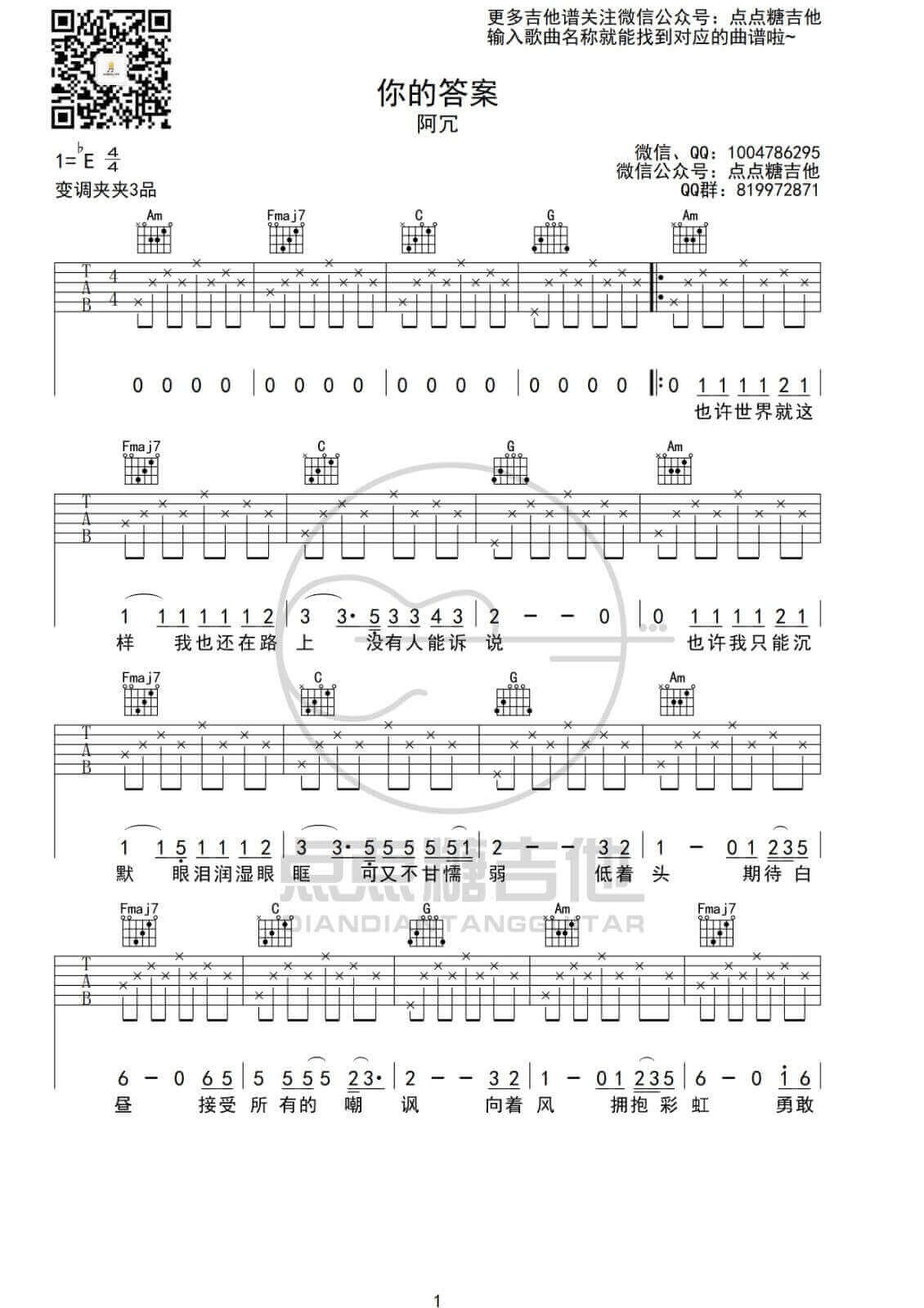 曲谱介绍: 你的答案吉他谱采用了C调指法,由点点糖吉他编配完成。这首歌整个基调都是激情澎湃的感觉,我们总会遇到黑暗,但是这不代表我们永远置身于黑暗之中,号外:在这里小编要推荐这首不可一世吉他谱,它也很好听,大家赶快学习起来啦,不要犹豫!