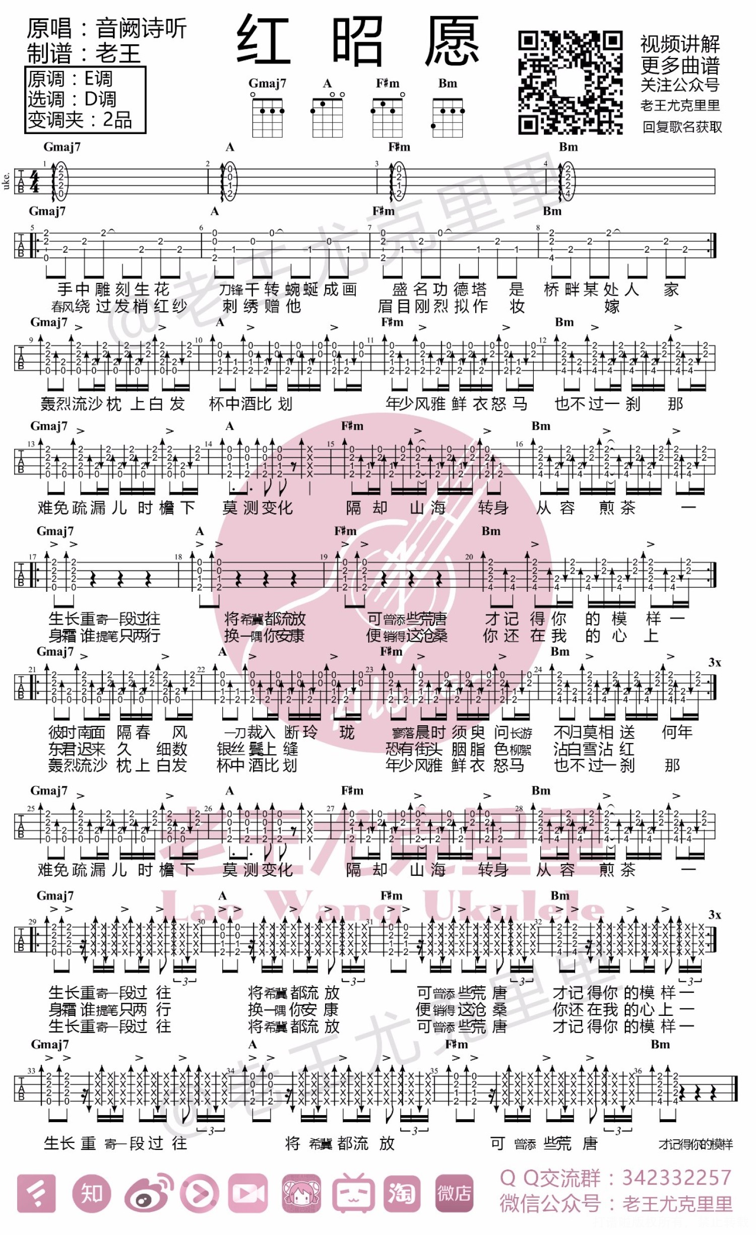 曲谱介绍: 新年第一天,老王就来送福利啦! 大家期待已久的红昭愿的视频教学来咯,还有超详细的曲谱,满足你们的要求,每个月跟着老王学一首完整的表演级的曲目! 然后老王给大家文字介绍下视频教程里的知识点: 视频比较长,超过了30分钟,不过分为三个板块,大家可以根据自己的情况选择观看。 第一部分为改编思路讲解,分析怎么把歌曲改编成适合尤克里里演奏,怎么弹更好听的思路。 第二部分为变调方法讲解,多种情况具体分析怎么选择正确且适合自己的调和指法,变调夹的使用注意事项。 第三部分为演奏详解,逐一小节讲解演示,包含学习多种节奏型,把二指法融入扫弦提高扫弦律动感和层次感的进阶方法,制音和制音时扫弦的应用,三连音的使用,卡拍时的节奏型处理等等知识点。 还是那句话,老王的教学思路就是授人以渔,希望大家看完之后不光学会了这首歌,也学到了很多更重要的实用知识,从而提高自己的音乐素养和琴技! 加油吧~   演示视频   教学视频   红昭愿曲谱
