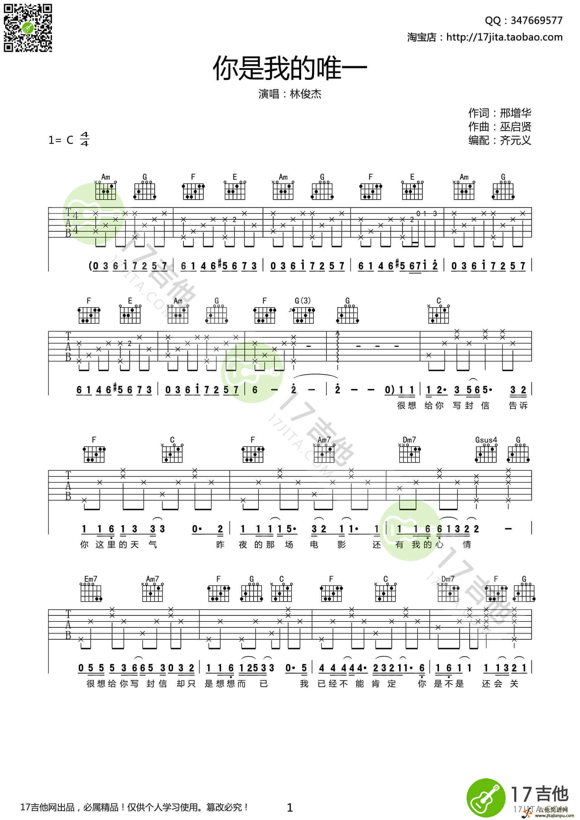 曲谱介绍: 你是我的唯一吉他谱采用了C调指法,由17吉他编配完成。号外:在这里小编要推荐这首花火吉他谱,它也很好听,大家赶快学习起来啦,不要犹豫!