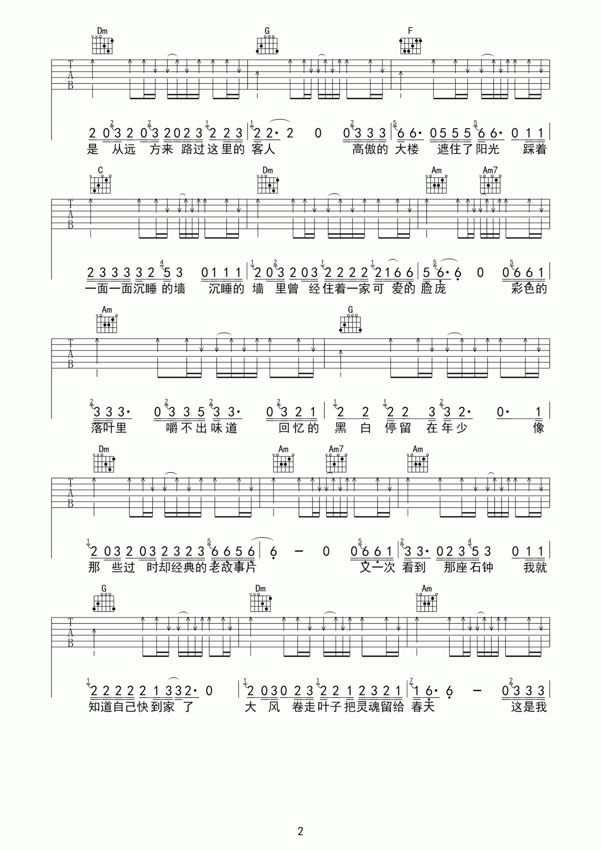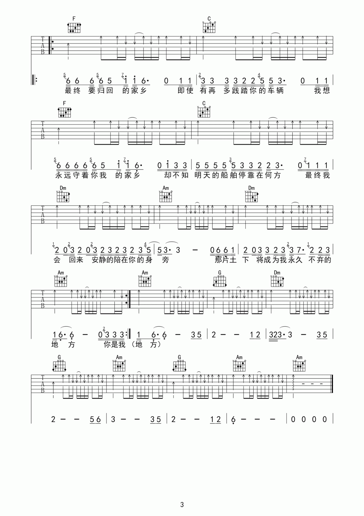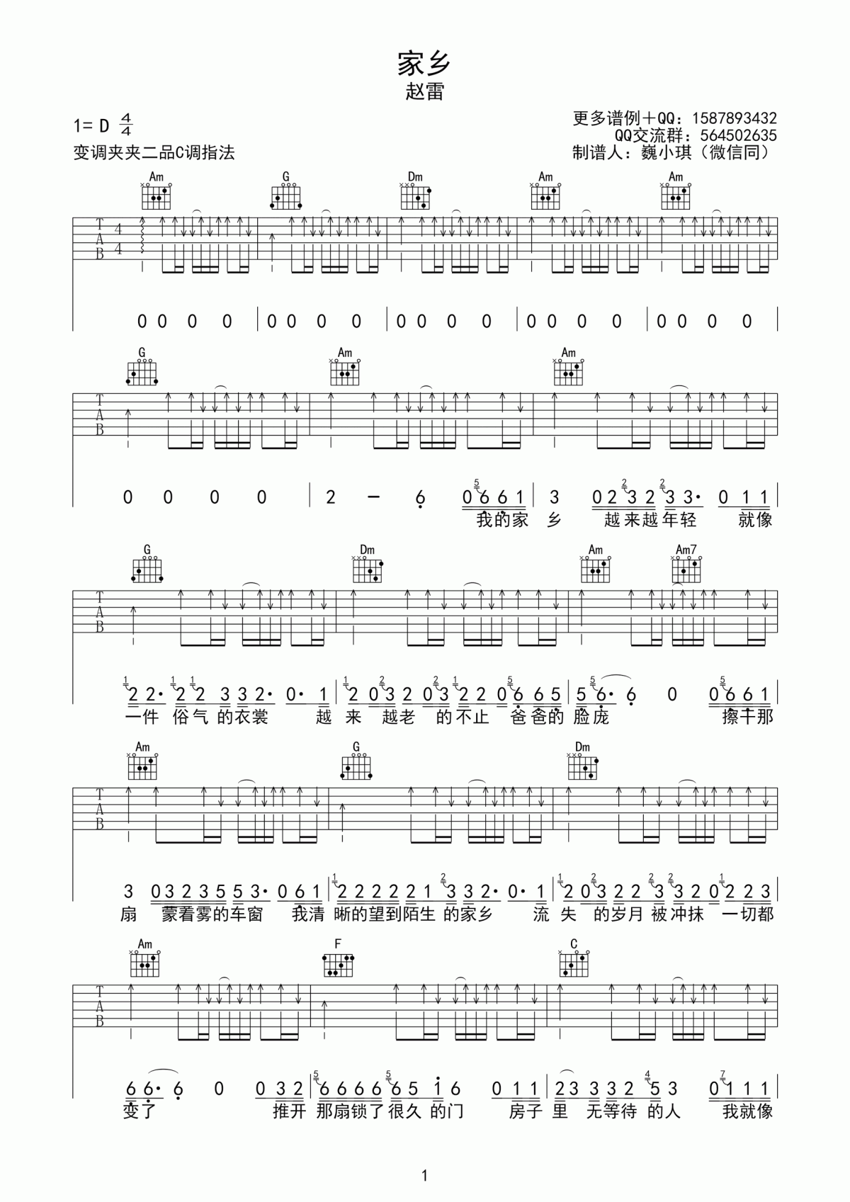曲谱介绍: 赵雷《家乡》吉他弹唱谱,采用C调指法编配,共有3张高清图谱。