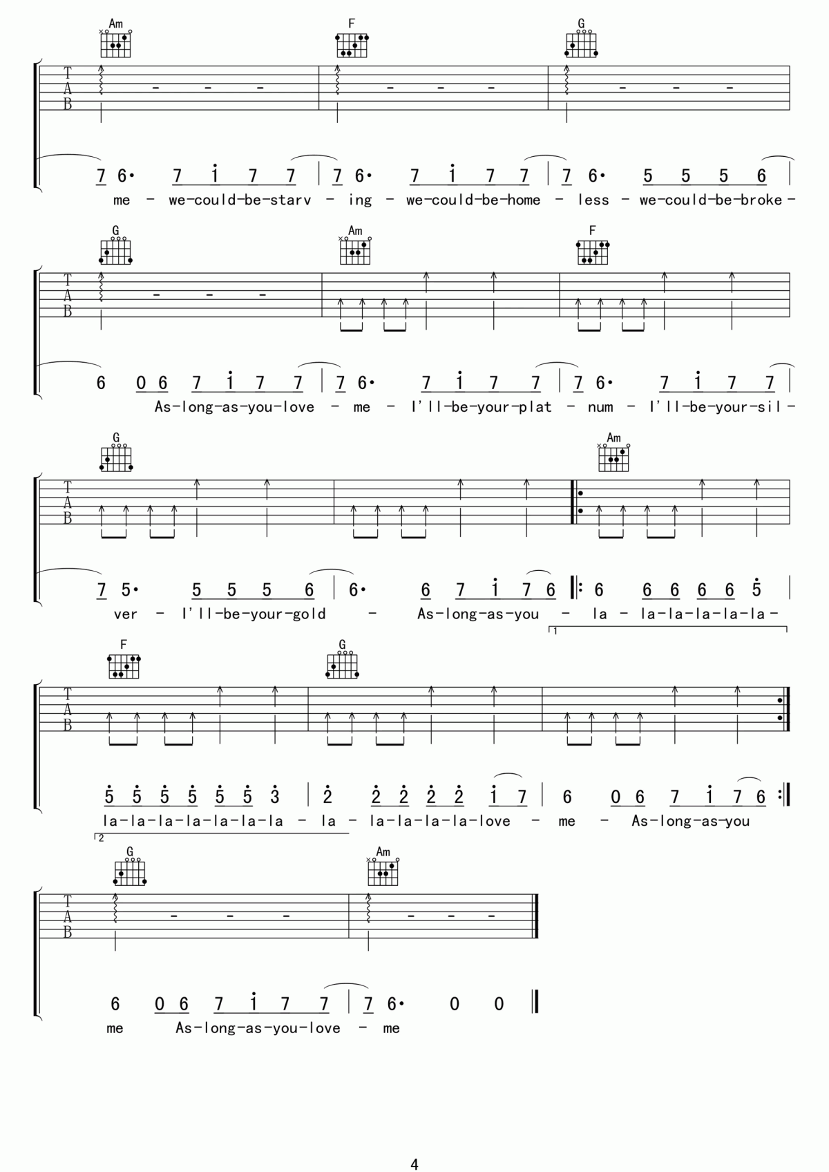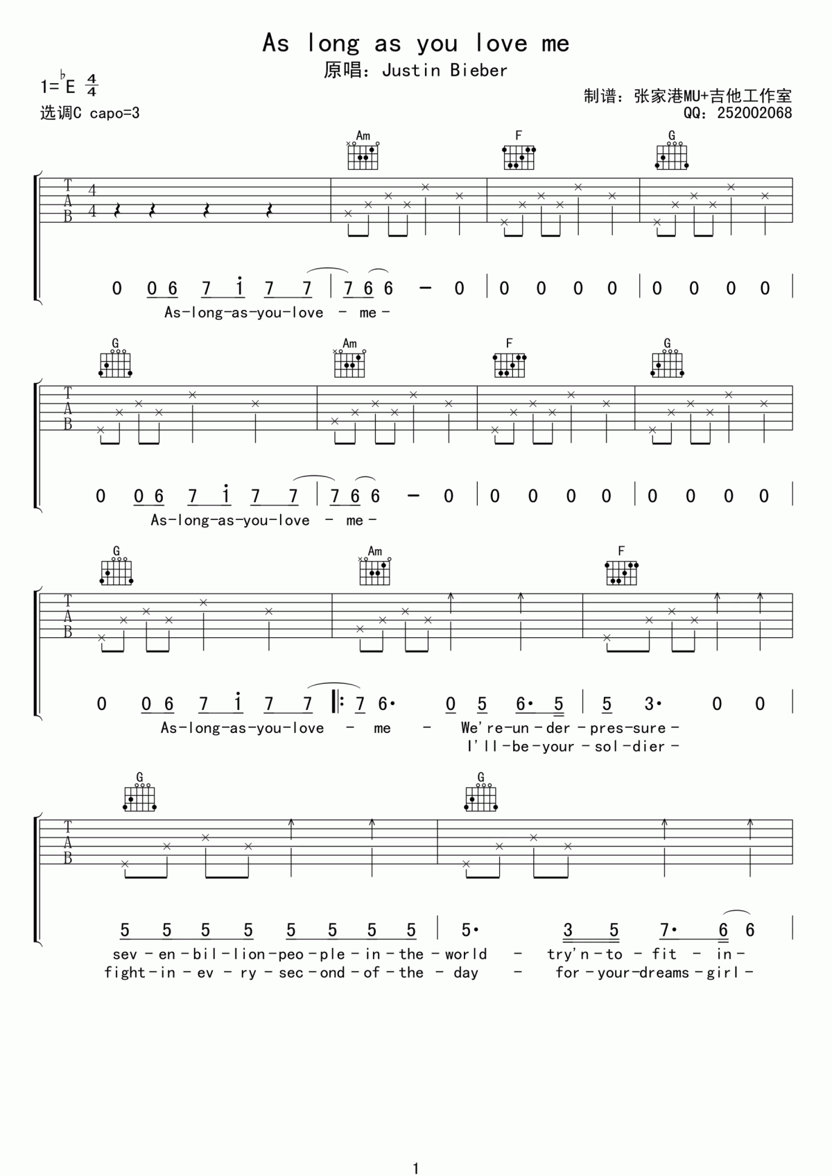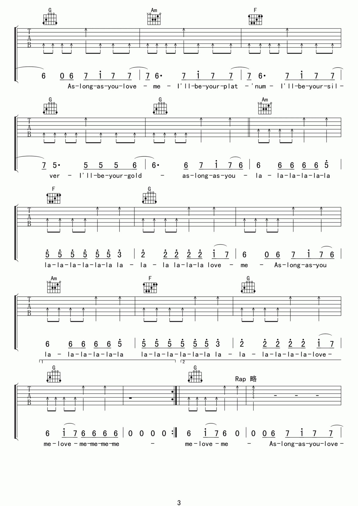 曲谱介绍: As《AsLongAsYouLoveMe》吉他弹唱谱,采用C调指法编配,共有4张高清图谱。